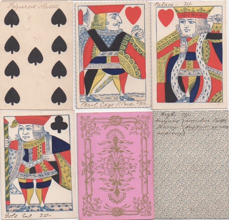 Here's an interesting glimpse into the prices and trade-names of their cards in the 1850s. The pink and gold back is for the Gold Enamelled series; the bottom right card tells us that High Moguls, Harrys and Andrews have similar patterns, are of superior quality and cost 17/- per dozen packs.