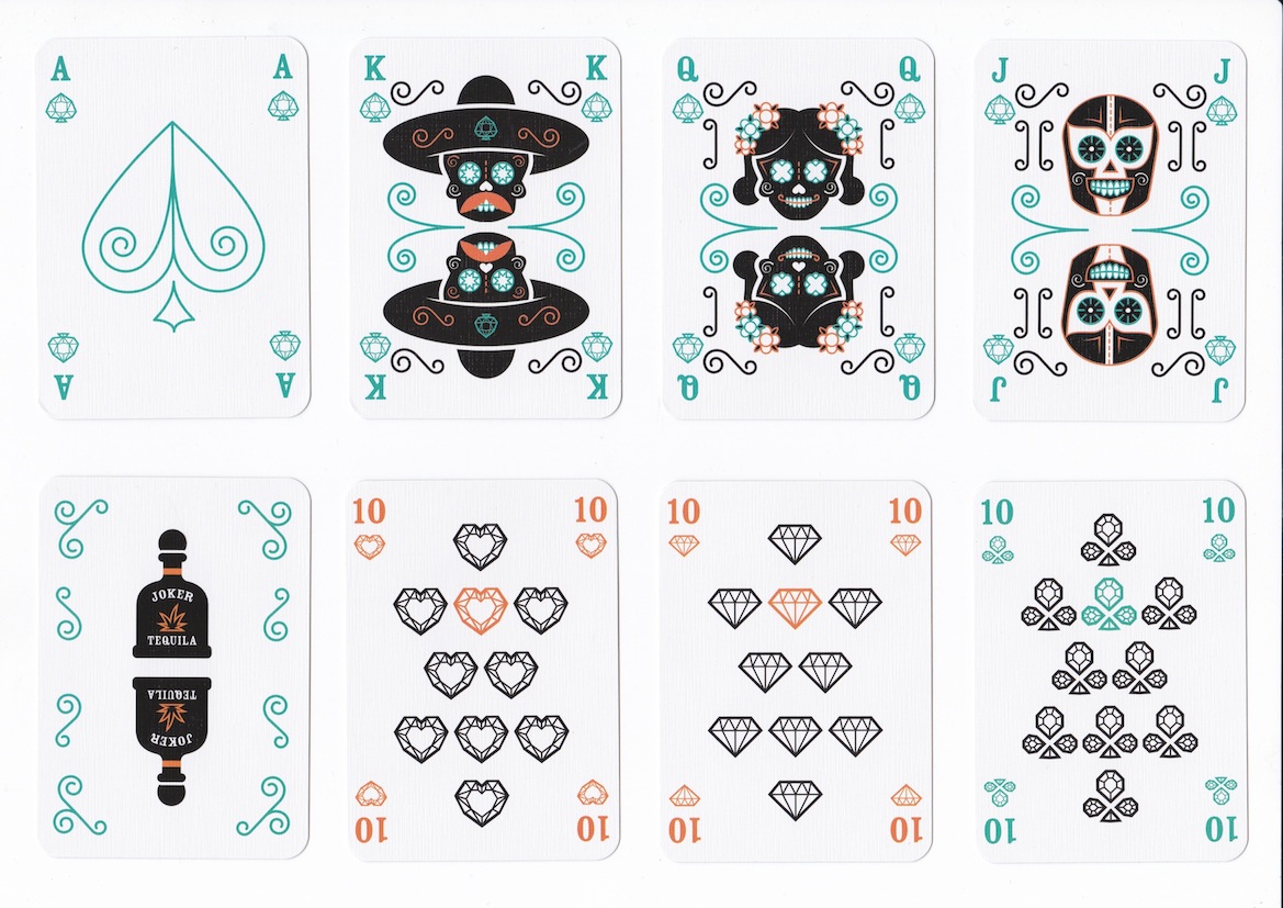 Carta Mundi have also joined in this market with a non-standard pack for Calavera tequila. The suit-signs have been turned into faceted jewels, but in the process the hearts and the diamonds have ended up looking rather similar - not a happy outcome.