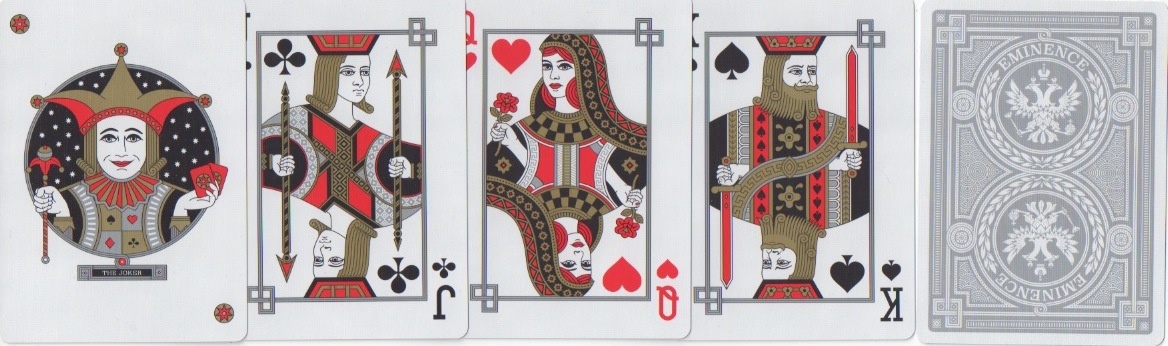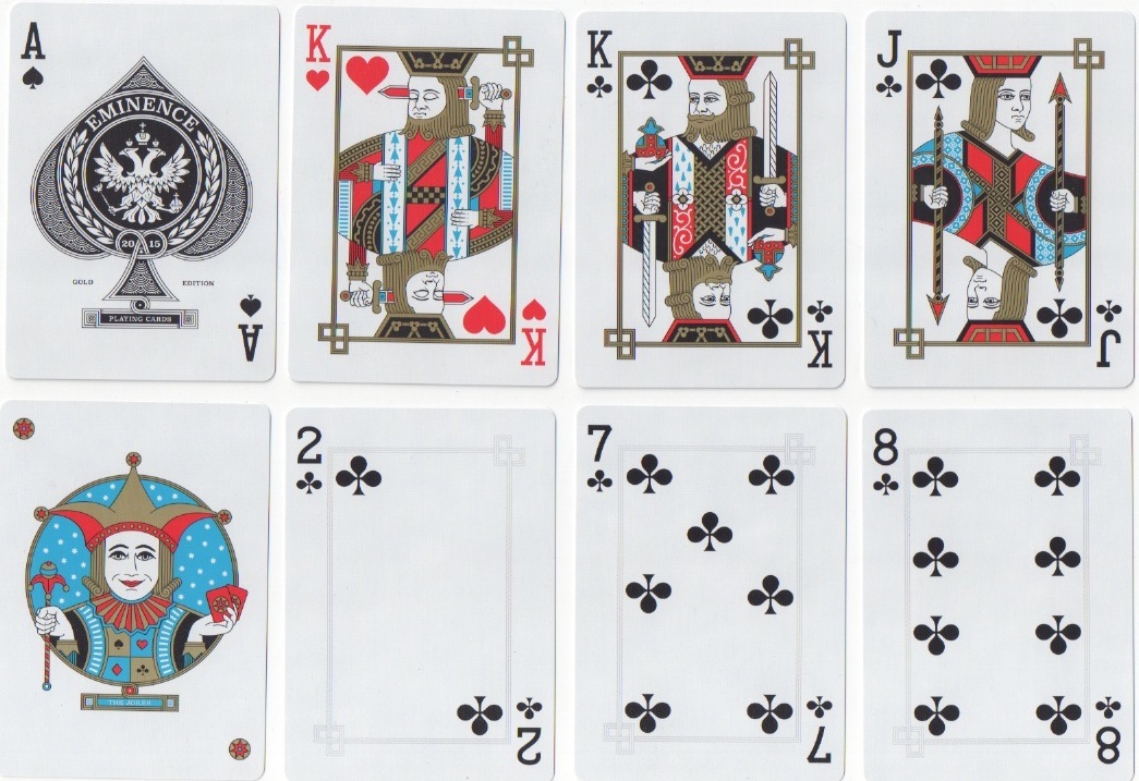 Eminence, with gold backs and redrawn courts; the sword really does go through the KH's head - no wonder his eyes are closed!; the hand orientations on the KC and JC are peculiar - they must belong to someone else. Note the diagonal 2s (and 3s) - a flashback to De La Rue's dexter indices of the late 1870s; the 7s (and 6s) have French pip arrangements and the 8s are 4/4, rather than 5/3. Eminence with silver backs has a different colour scheme on the courts.
