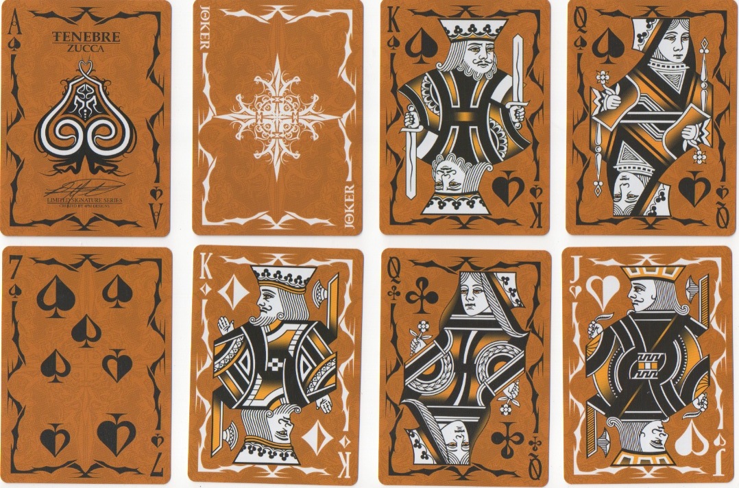Tenebre/Zucca, with recoloured US7 courts; note the unequally shaped pips and the French pip arrangement on the 7 (also on the 6s and 8s). Tenebre means darkness, gloom.