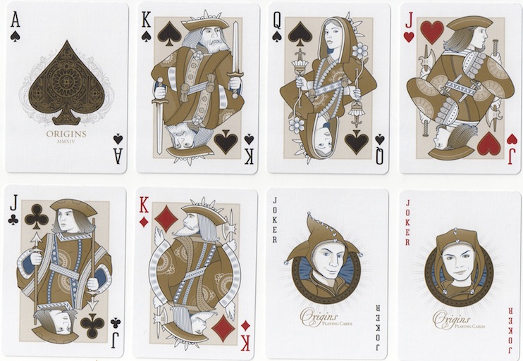 First off, there are the casino packs that are usually marked or holed in some way, when they have been used once. These have standard courts, but have indices in different positions depending on the value, or the courts have been squashed to make way for a large index. Look at the overlap of some of the parts of the original design, e.g. the QS's sceptre over her headdress. Here are two examples.