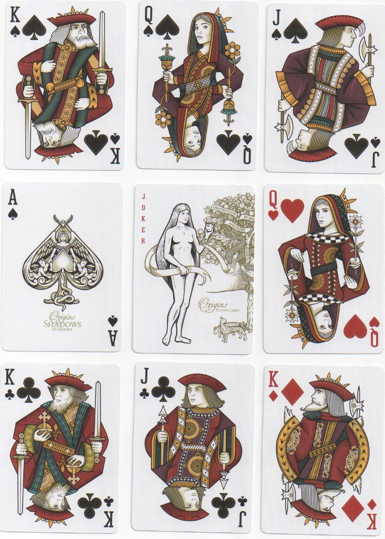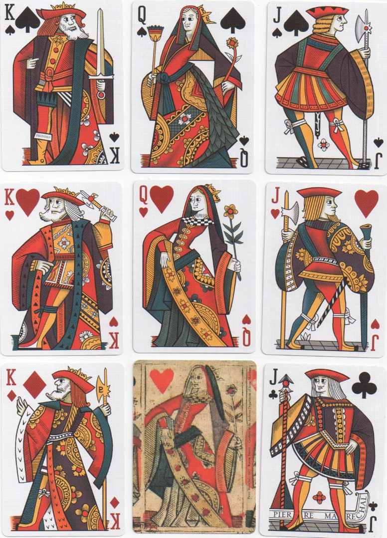 Another of my favourites is the set designed by Rick Davidson, who went back to the original single-figured Rouen pattern and made a modern version of it called Origins► There are now two more to add to the Origins series. Shadows is a revision of the original designs in more traditional colours including a dull purple found in some early examples; Rouen 1567 is a revival of the original Pierre Maréchal courts, retaining the single figures and adding the missing red jacks by using later known examples as models. An extra card adds a reproduction of the original QH from the sheet.