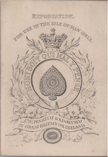 The best information about Isle of Man cards is to be found in Mike Goodall's booklet covering 1863-1930. From very early in its history the island kept a measure of independence and never became part of the United Kingdom, retaining its status as an internally self-governing Crown dependency. This meant that playing cards were technically exported to the island. Whether there was a requirement to use an export garter AS I can't say, but by the Old Frizzle period there was a special export ace for the Isle of Man. It was unappropriated, so makers' names do not appear on it. Both Whitaker and Reynolds used the ace.