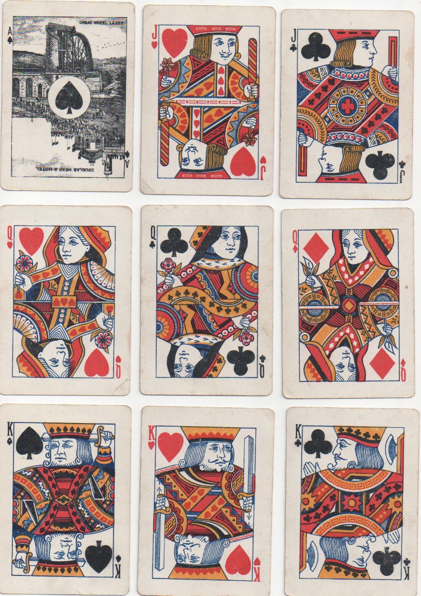 After the end of the Frizzle period makers made cards that were designed specially for the island, most of them having pictorial aces. It is quite remarkable how many different makers made such cards, both English and foreign. The most common are those by Goodall and by Valentine. In Mike's book he refers to the latter as "Unknown British", but on the basis of the joker design (not all packs were sold with a joker), Valentine is the most likely maker of the cards, although they also had other non-anonymous packs with different courts. Here are the two types: what is interesting about the anonymous ones is that they are a complete mix up of Goodall-like courts with all the figures in the wrong suits.