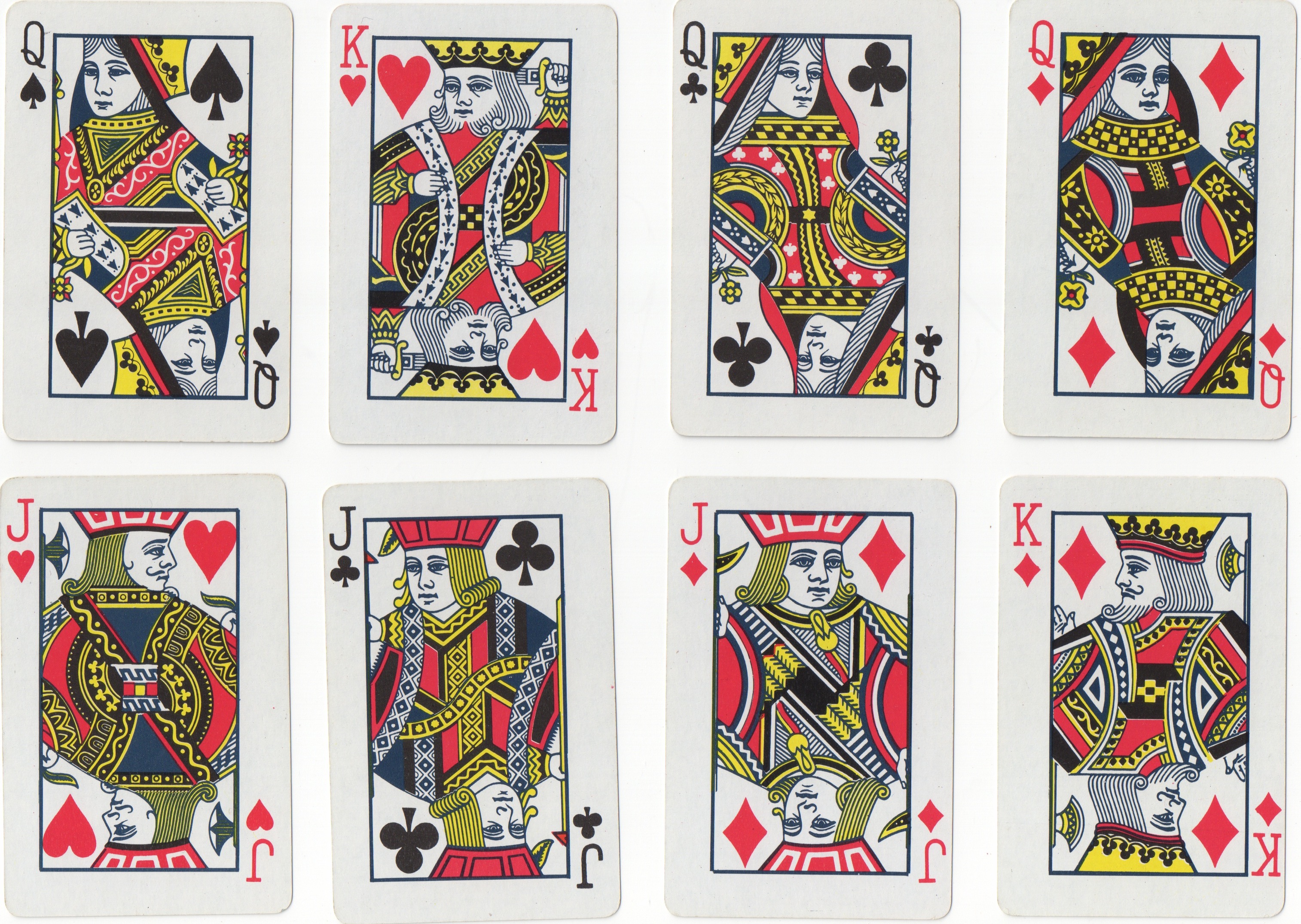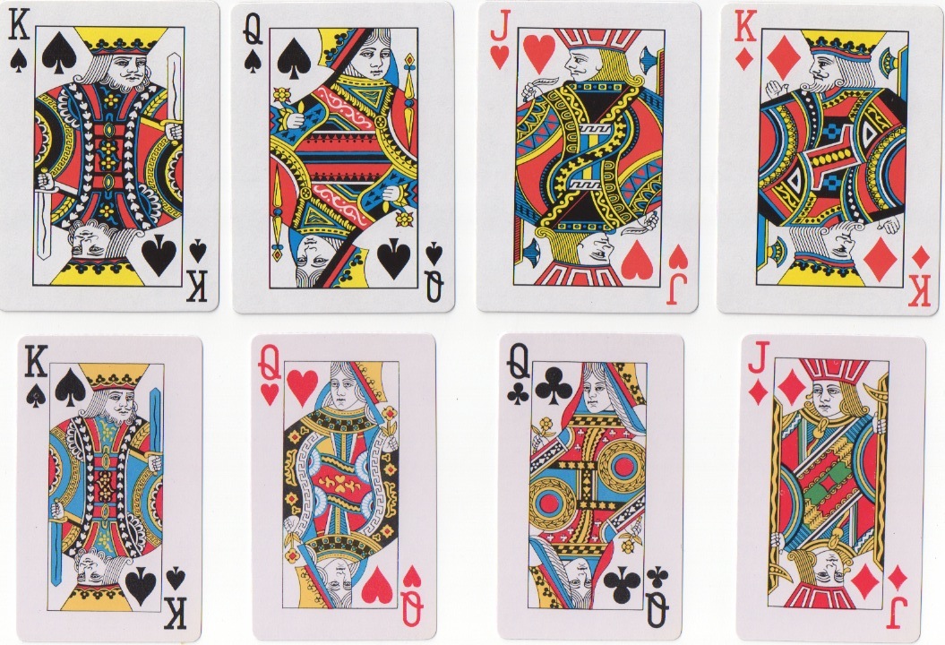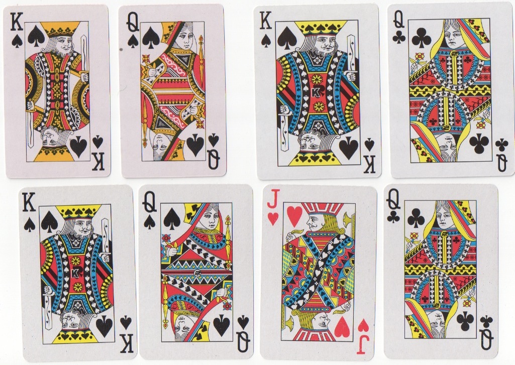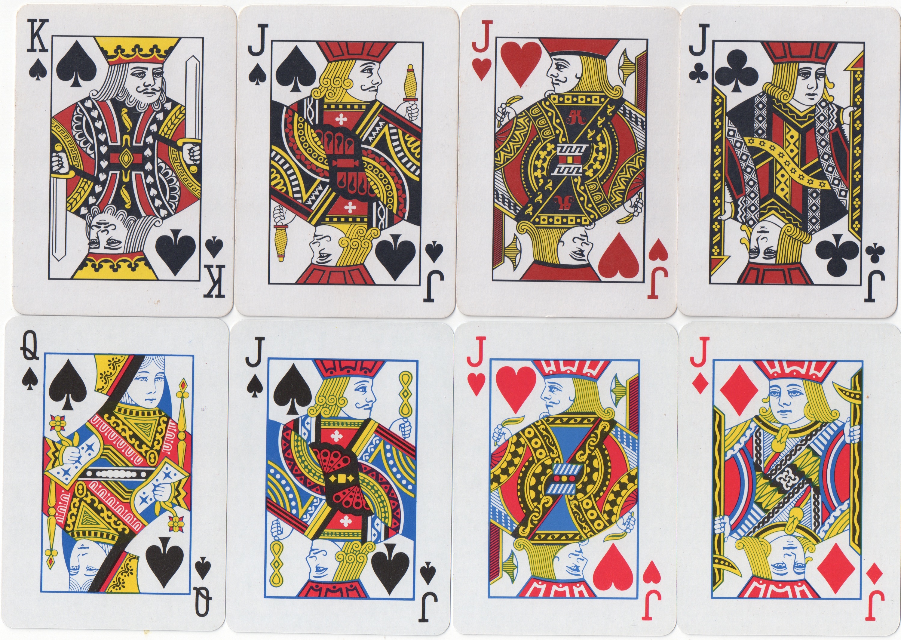 I'll start with the design which is perhaps the commonest by now (though it wasn't to start with), and that is a copy of the USPCC's poker cards, originally designed by NYCCC (US7). Below is an original US7 court set.