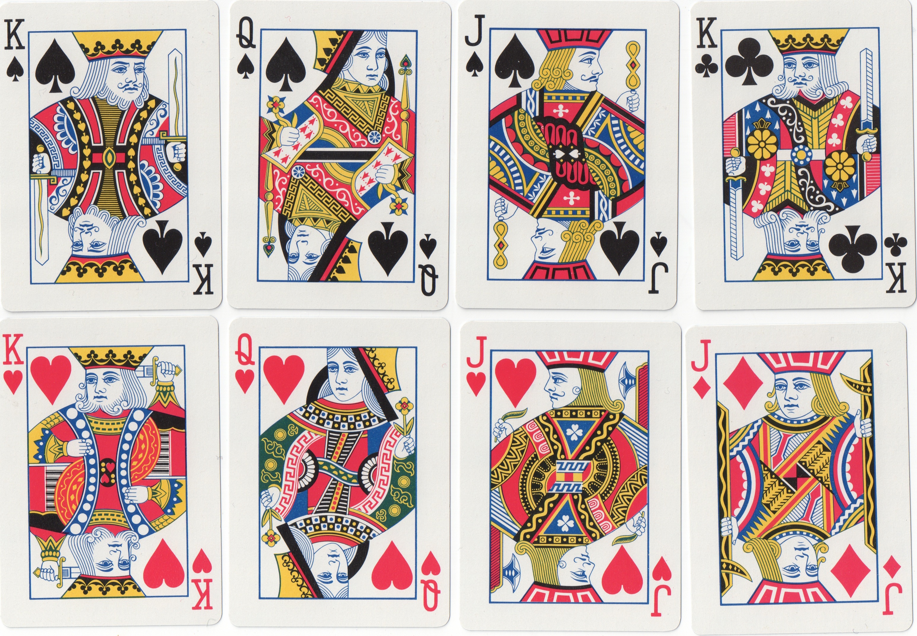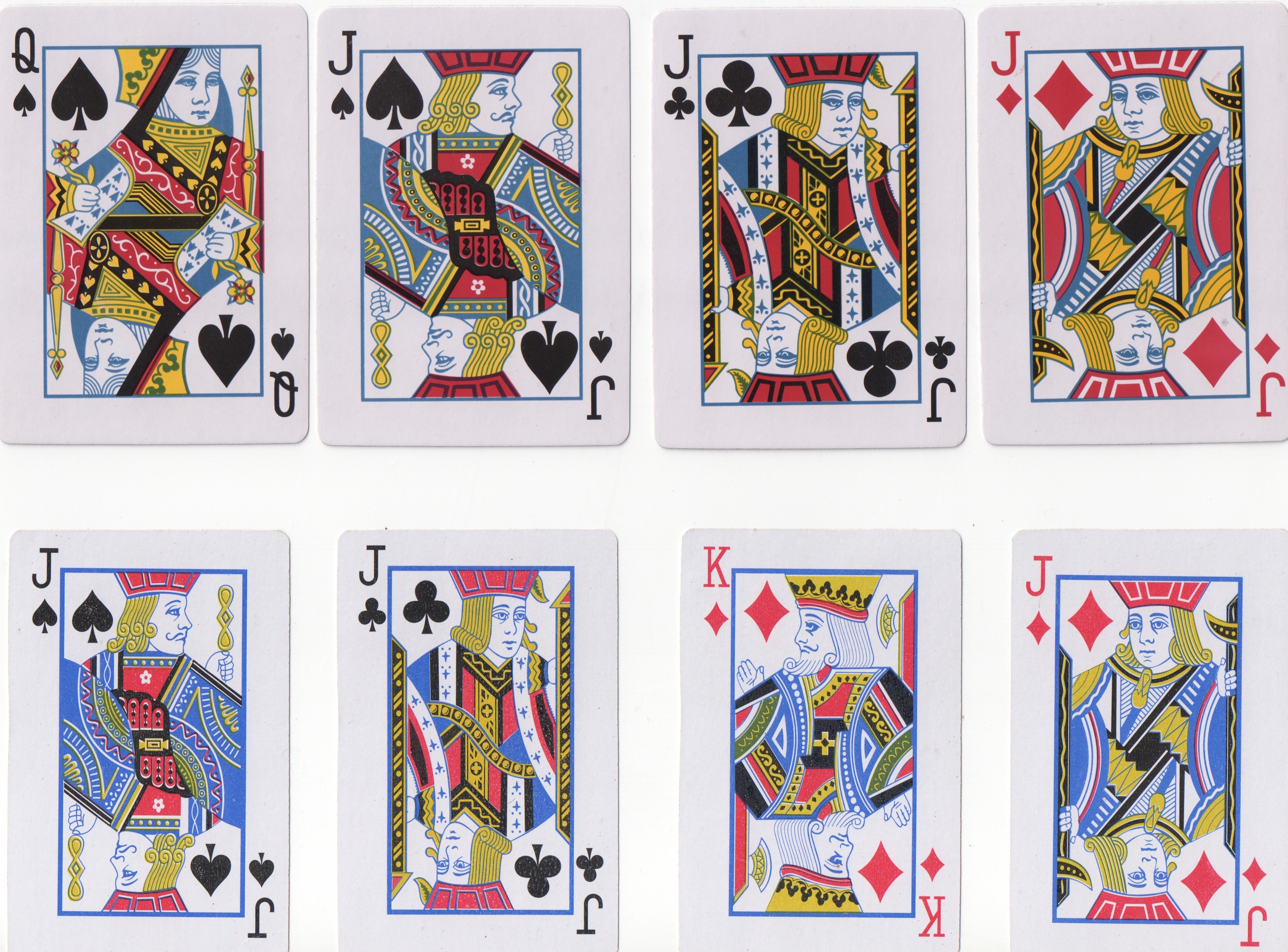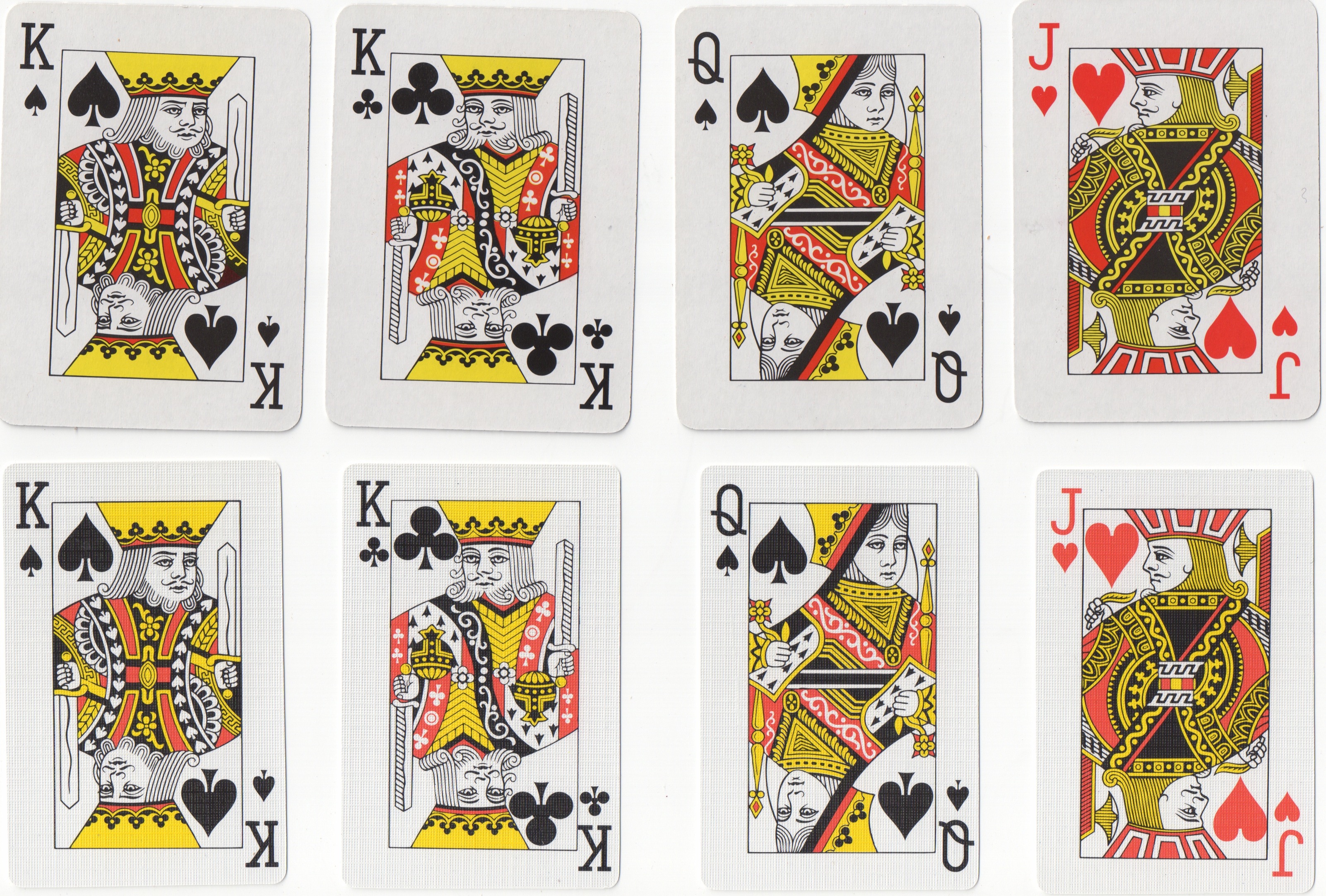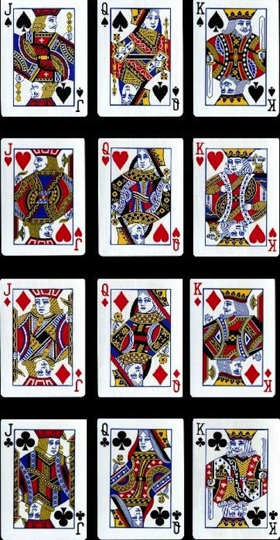I'll start with the design which is perhaps the commonest by now (though it wasn't to start with), and that is a copy of the USPCC's poker cards, originally designed by NYCCC (US7). Below is an original US7 court set.