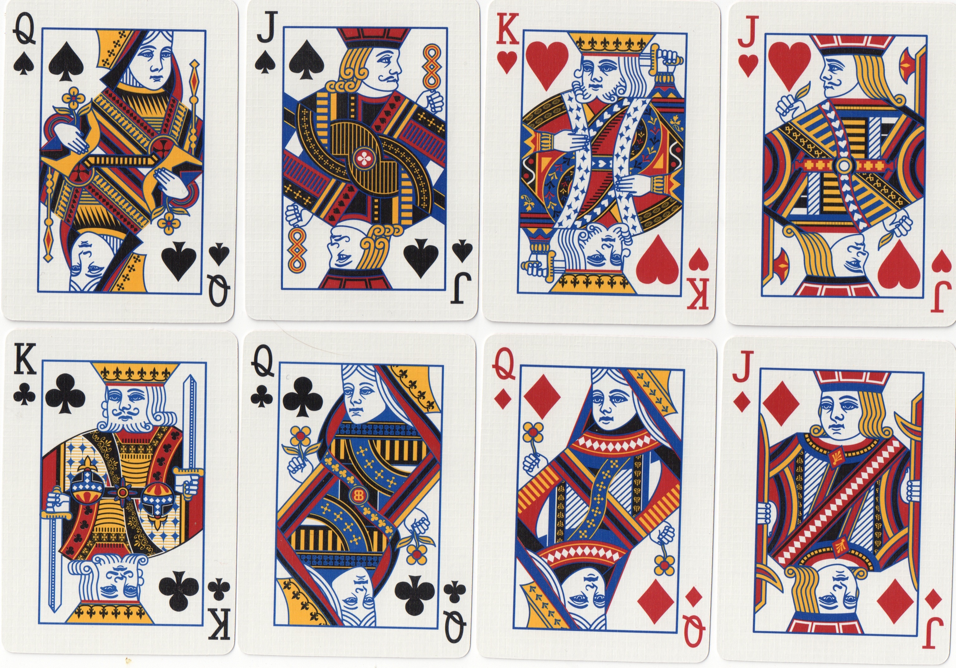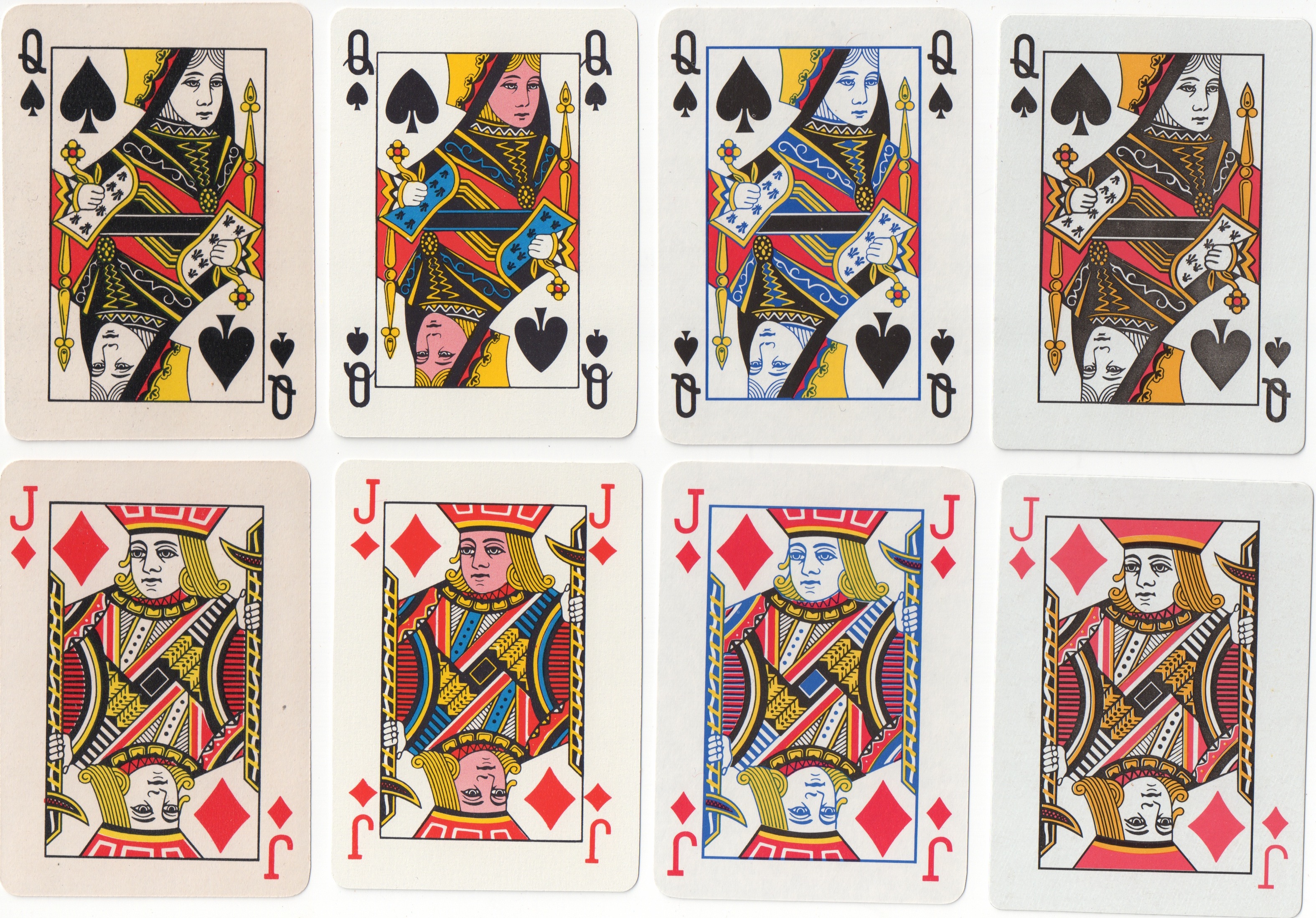 The top row shows variation on the clothing, such as yellow spades on the QS's bodice, circles at the centre of the JS and ermine on the JC's cloak edge. The bottom row is a bridge-size version with unusual colour distribution, especially the blue on the JD. The yellow has been overprinted on blue on the KD's roundels, giving a green colour. From c.2010.