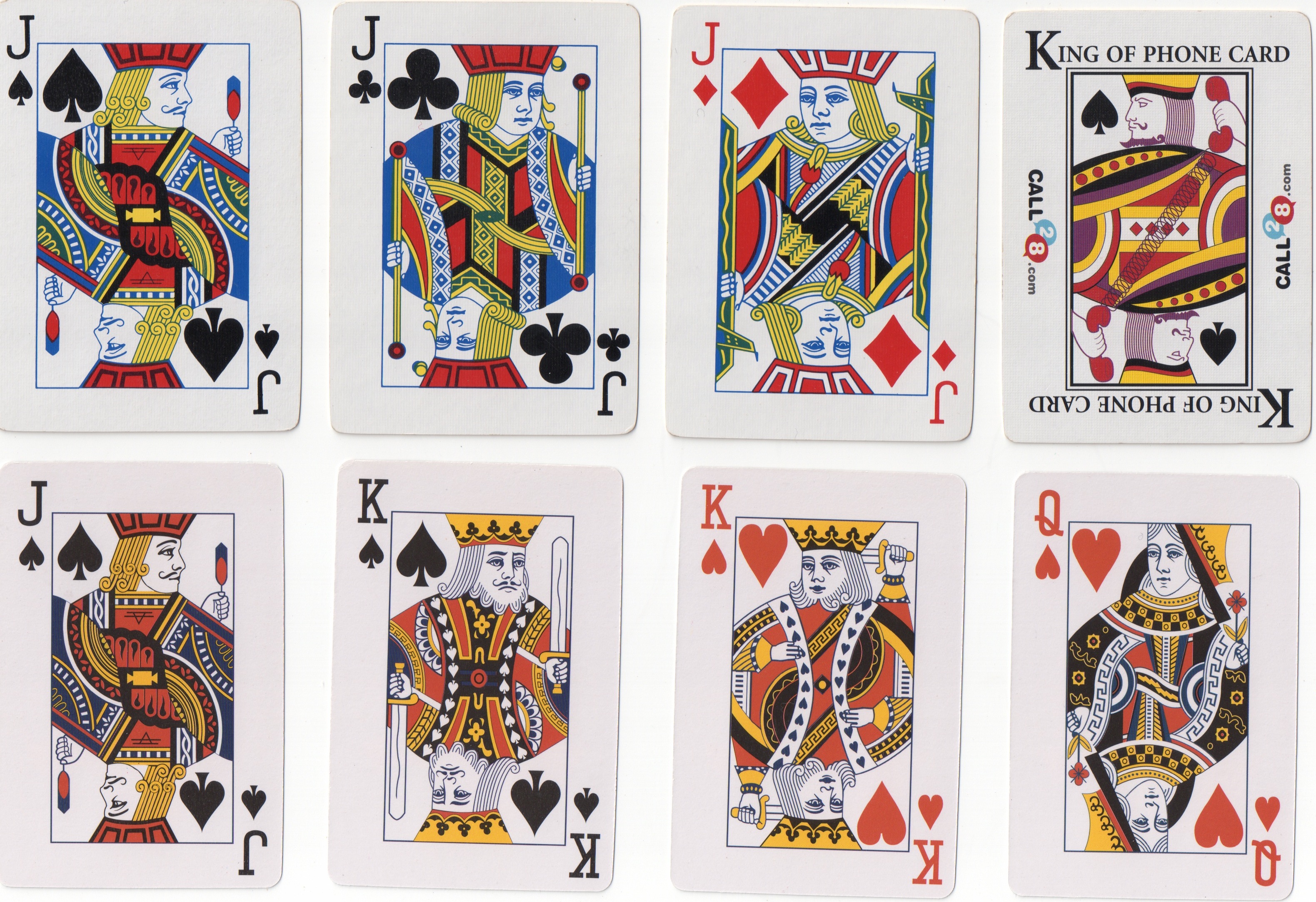 In CUS7.3 the JS holds a small paddle, the JC a wand with two spherical ends, and the hook ono the JD's pike is angled. The top example is from a pack advertising phone cards: the right-hand image is the back design, but the kings are all of this design for this pack without the legends and with the appropriate suit-signs. The bottom one is a bridge pack in three colours: the corner pips are upside-down on the KH and QH! c.2000-2005.
