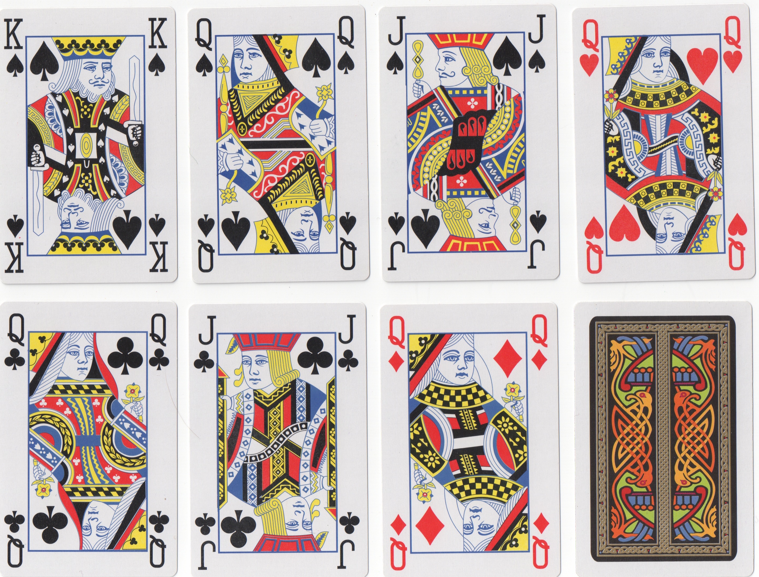 Sometimes I suspect that court designs are a one-off for a particular order. I have so far only seen CUS7.9 in a pack called Celtic (see back design) made in China in c.2005. All the queens and jacks are turned from their positions in US7, resulting in a left-facing JS and a ¾ right-facing QH.