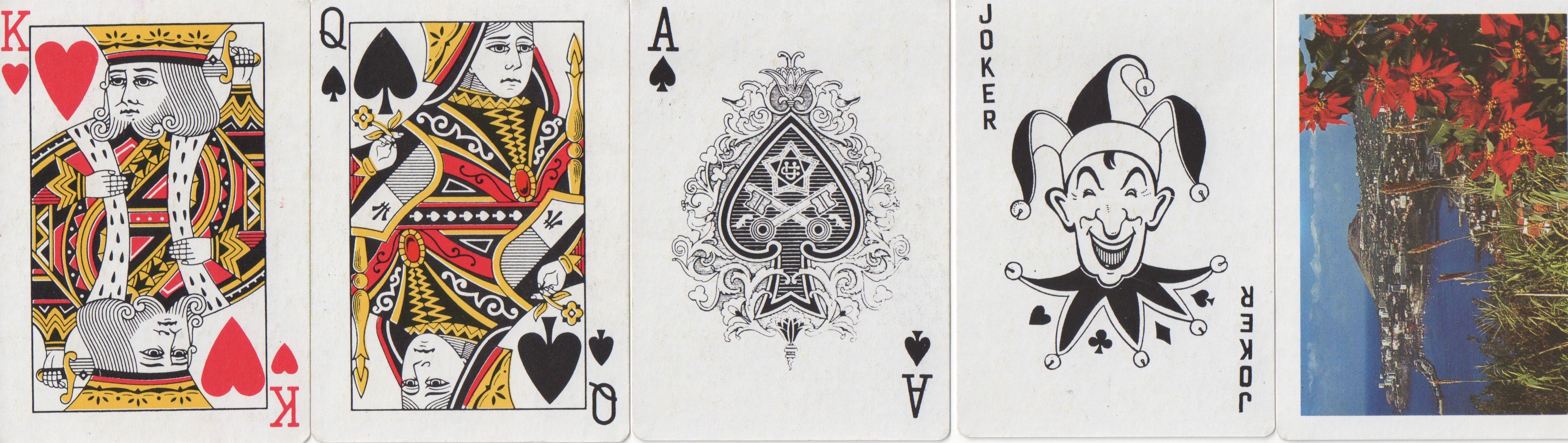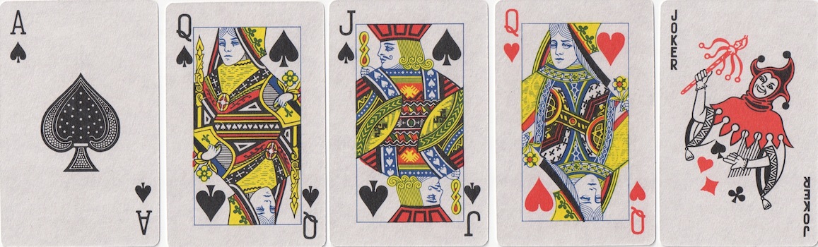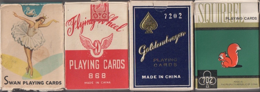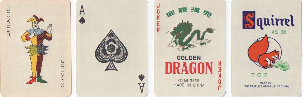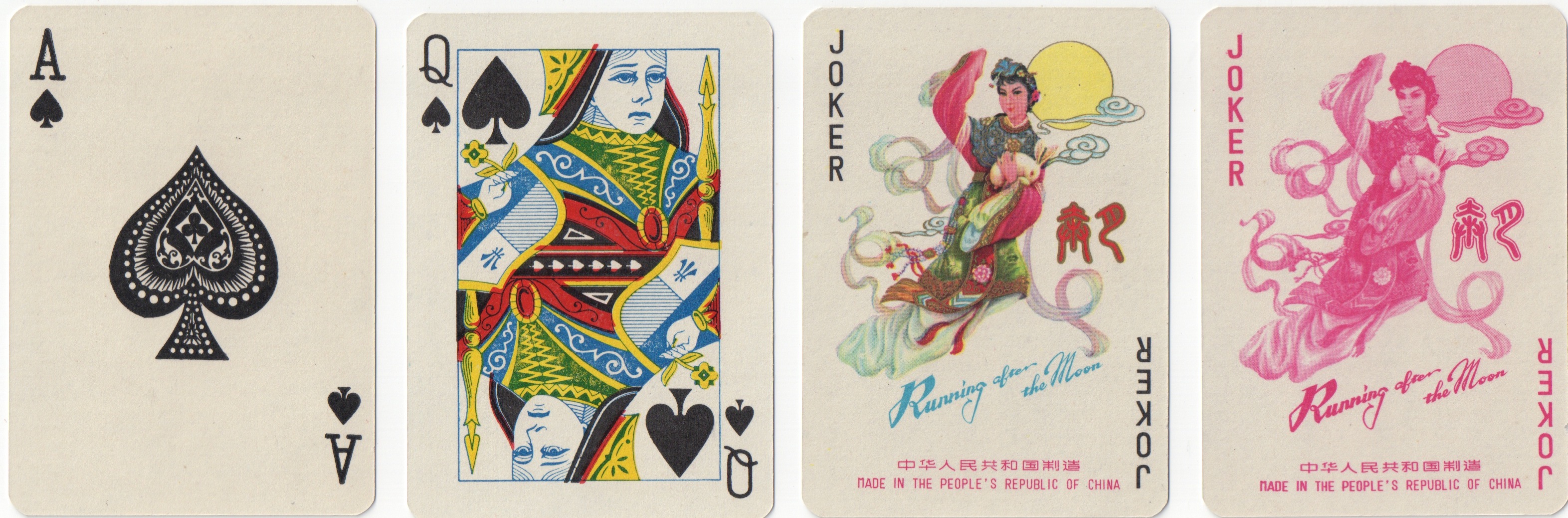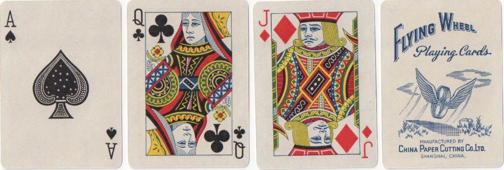 Another design used in China is US5, originally by the American Bank Note Co., which was possibly the model for Whitman's US5.1, as it also has a left-facing JS and a QH with a right-hand pip. The Chinese version (CUS5) is difficult to tell apart from the original except by means of the AS, joker and card quality.