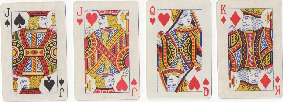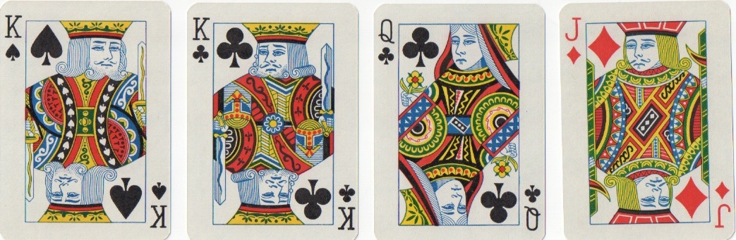 The commonest design used today is the ubiquitous modern USPCC Bicycle courts, as discussed on page 54. But it wasn't always the case. When Chinese cards started to appear in England in large numbers after the import duty was abolished in 1960, the commonest courts were derived from Whitman's design for bridge-size cards. Here is the original design: