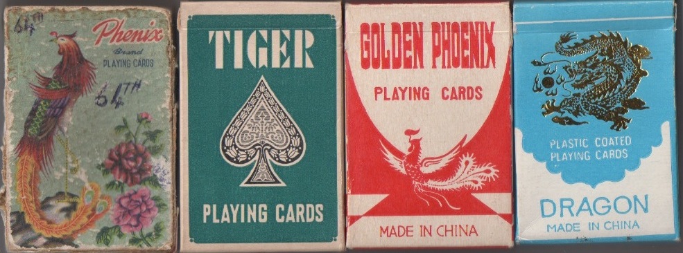 The brands are very varied and you can't predict the cards inside any particular box. Here's a selection: 155 Flying Wheel, Phenix, 33 Tiger, 77 Lion, 3005 Lion, 838 Dragon, 852 Kapokbrand, Berman, 6810 Golden Phoenix. I illustrate them with a few boxes below.