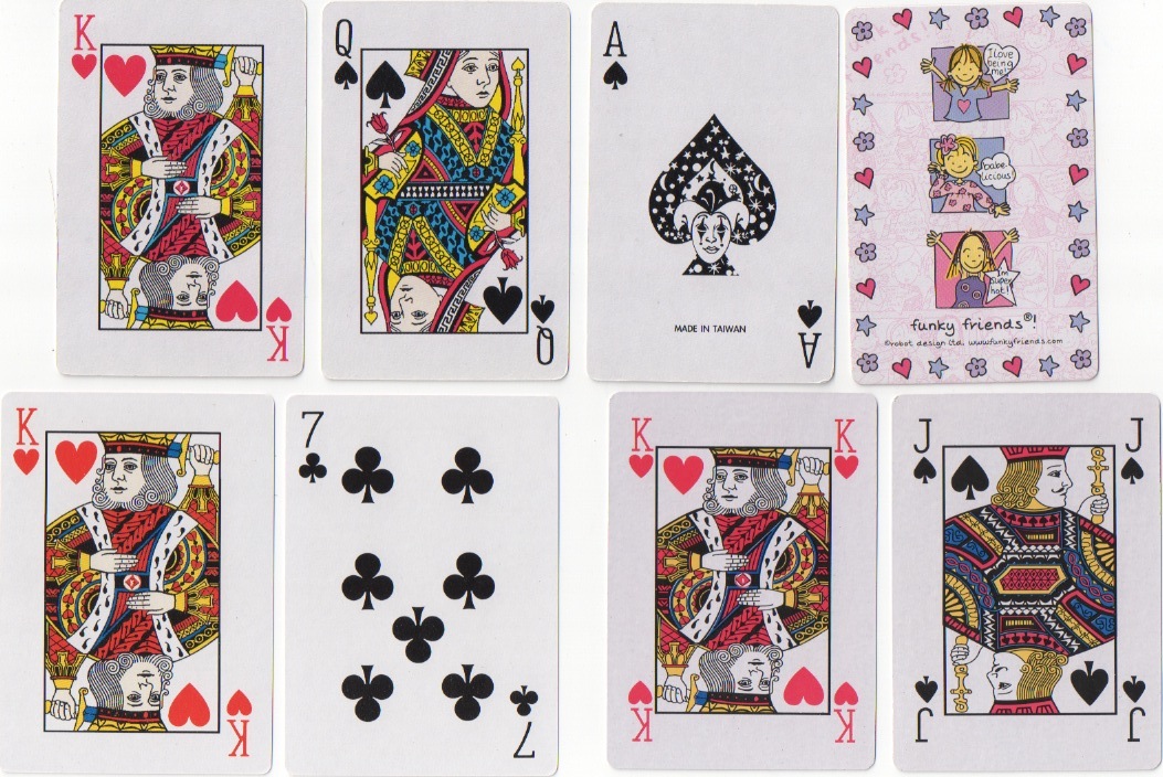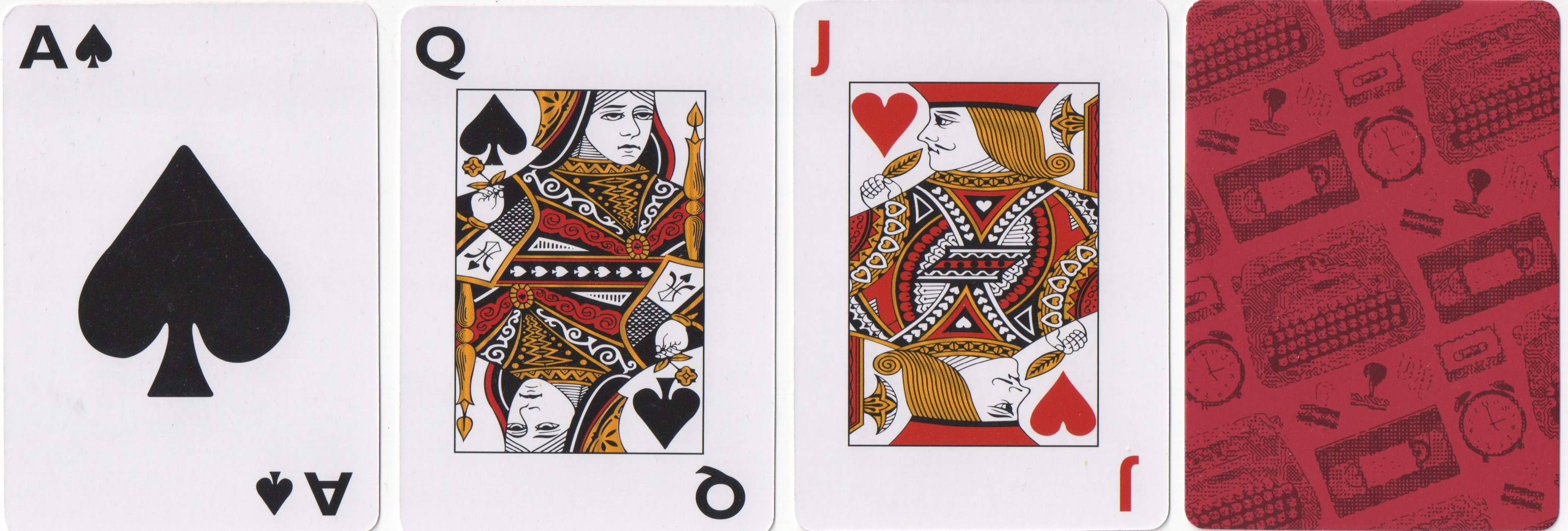 A few examples have imaginatively redrawn versions: the pack below was made for John Lewis in Taiwan in 2011, marketed as Queen (a brand name of Kuo Kau). The courts have been given faces in the style of Fournier's courts, although the design is CUS3.2.