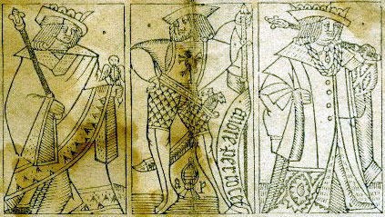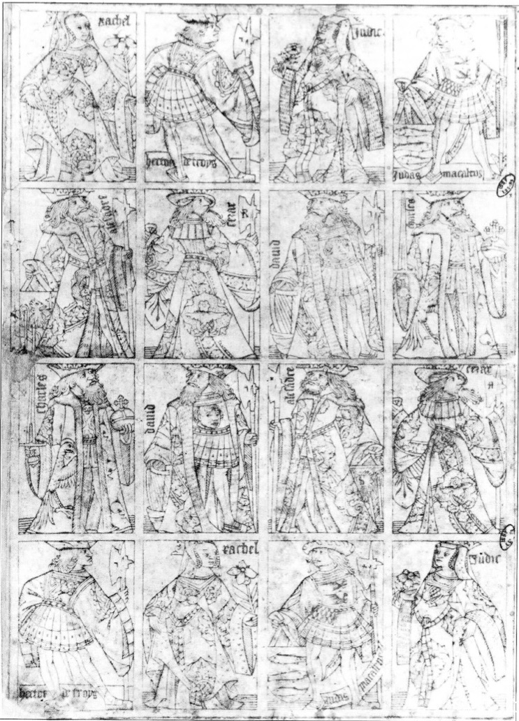Above: Uncut sheet by Guymier (?c.1500 or earlier). This is a very early version of the first Paris pattern; the name of the JC is Judas Macabeus (not Lancelot).