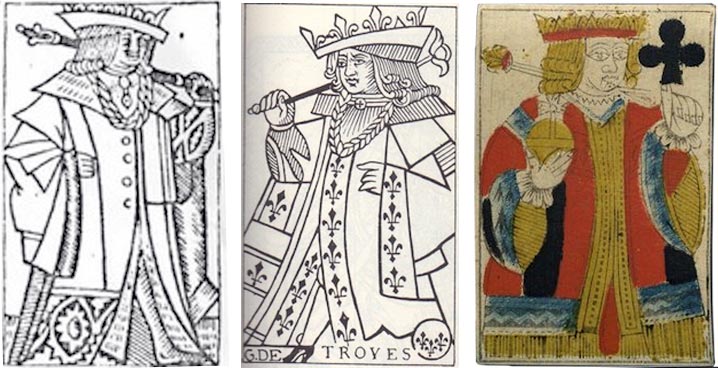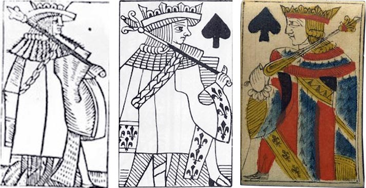 The earliest recognizable figures appear in the last part of the 15th century and the first half of the 16th and some of them are still around today, even though their appearance has changed, sometimes quite dramatically. One of the earliest court sets comes from Lyons by a maker named Andre Perrocet, who is known to have operated from 1491 until 1524. The KC from the Perrocet set turns up facing the other way in Burgundy and later in the 18th century Lyonnais pattern carrying an orb as well as a sceptre.