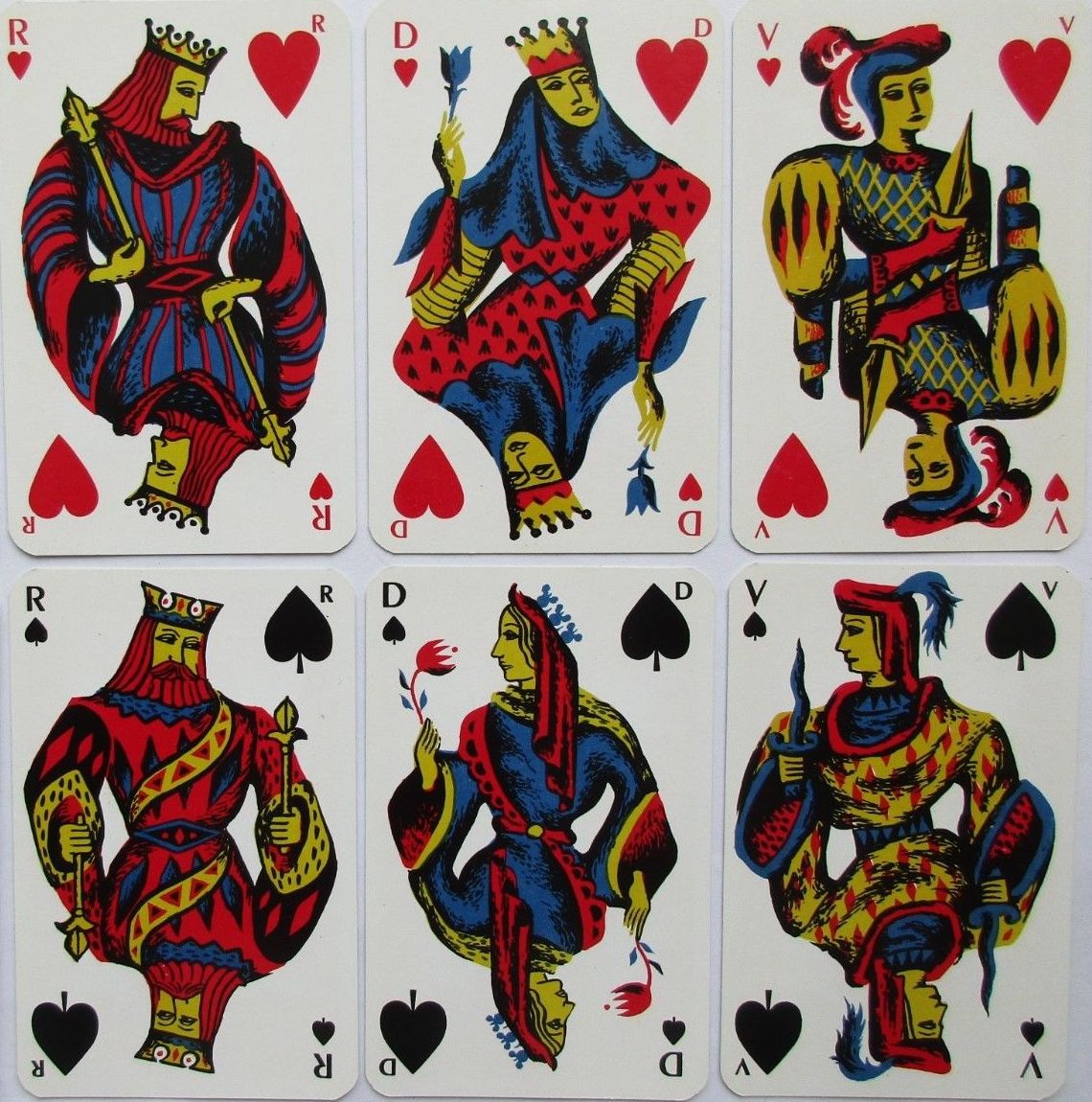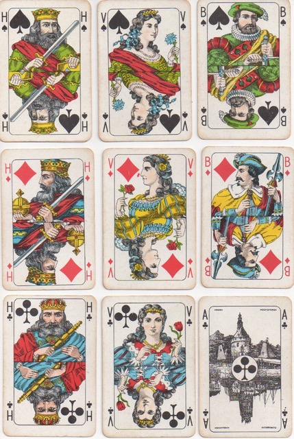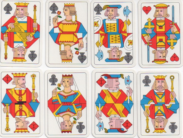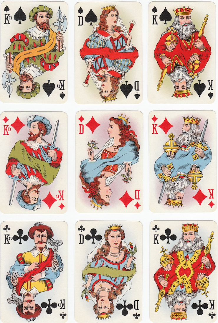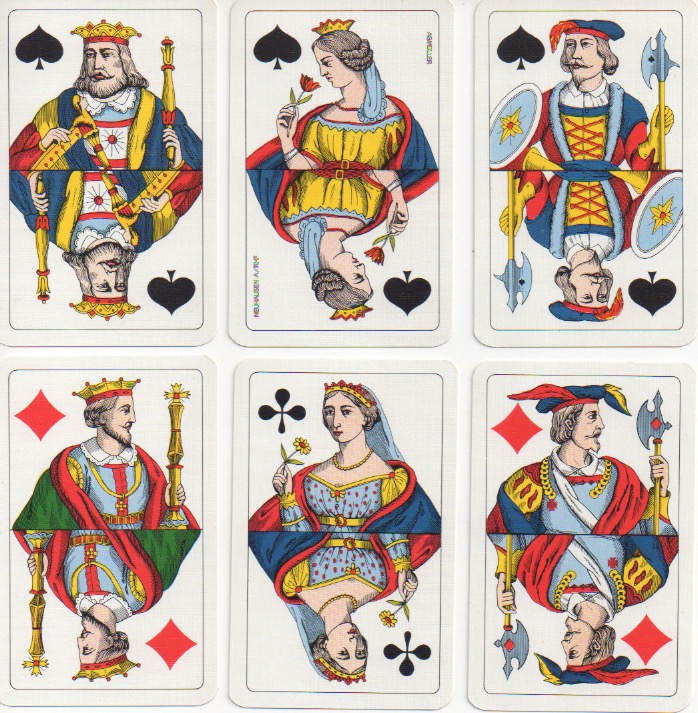 Several non-standard patterns from Turnhout have been copied elsewhere, but the best example of an in-house design that has become a sort of standard one is Dondorf's Rhineland pattern. The courts of each suit face the same way and there are a few hints of the French figures. It was copied in Turnhout with all the figures mixed up or altered in different ways by different makers and even Alf Cooke made a version for the Scandinavian market.