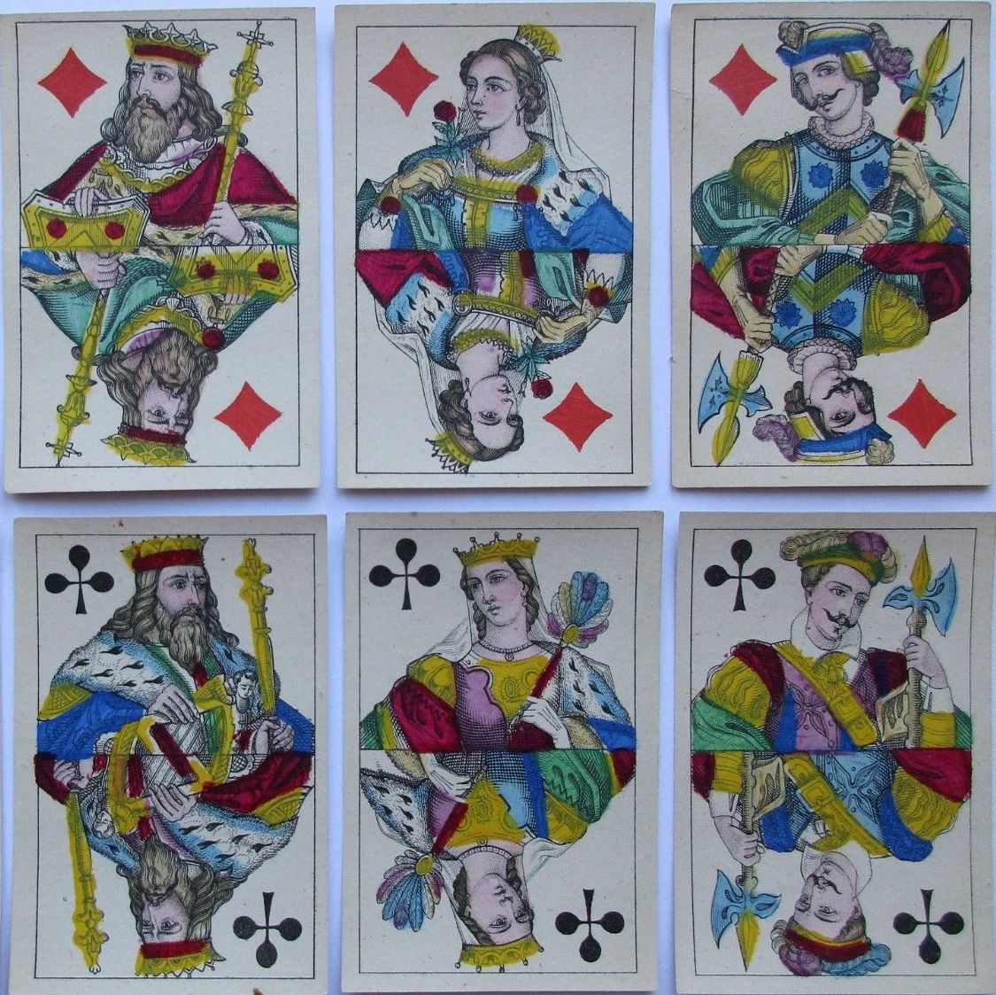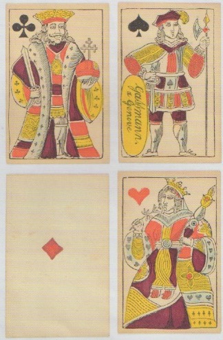 The standard Milan pattern has a number of French figures, but some are no longer traceable to a particular model. The KS = K1; KD = K4 holding a bird, but his head has been turned; QD could be Q2; JC = J1 and JD = J3.