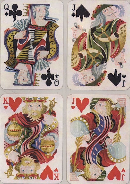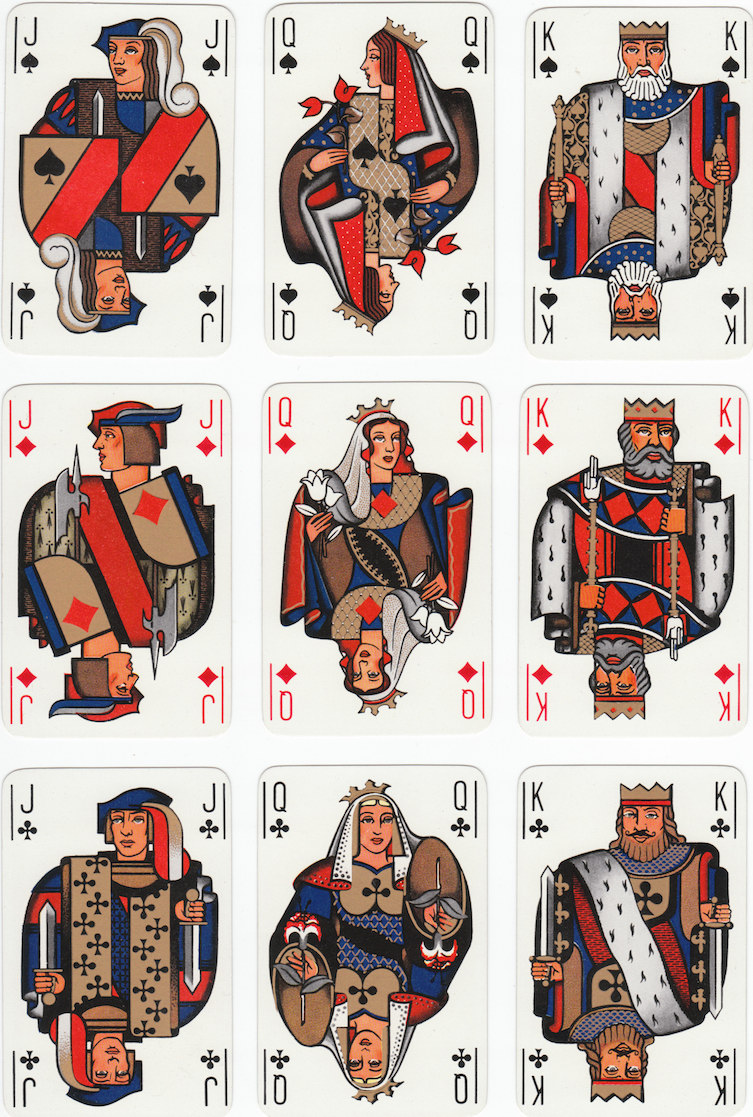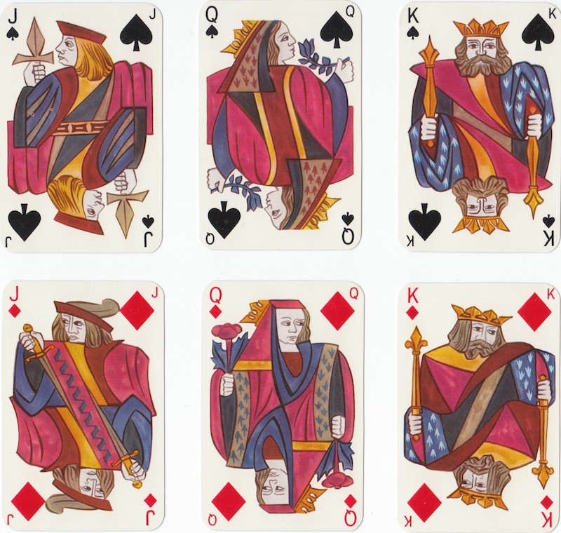 Finally, we can see how the regional French figures have inspired designers to produce their own version of them. Perhaps the first example is from Dondorf from the 1870s, the Birma Karte. These have been described as a version of the English pattern, but they are not. They have been given some characteristics of that style and a couple of the figures are found in the English pattern, but the courts are based on the regional figures we've been discussing here. (For a discussion of which figures are used, see my article in The Playing Card 45/2: 82-84.)