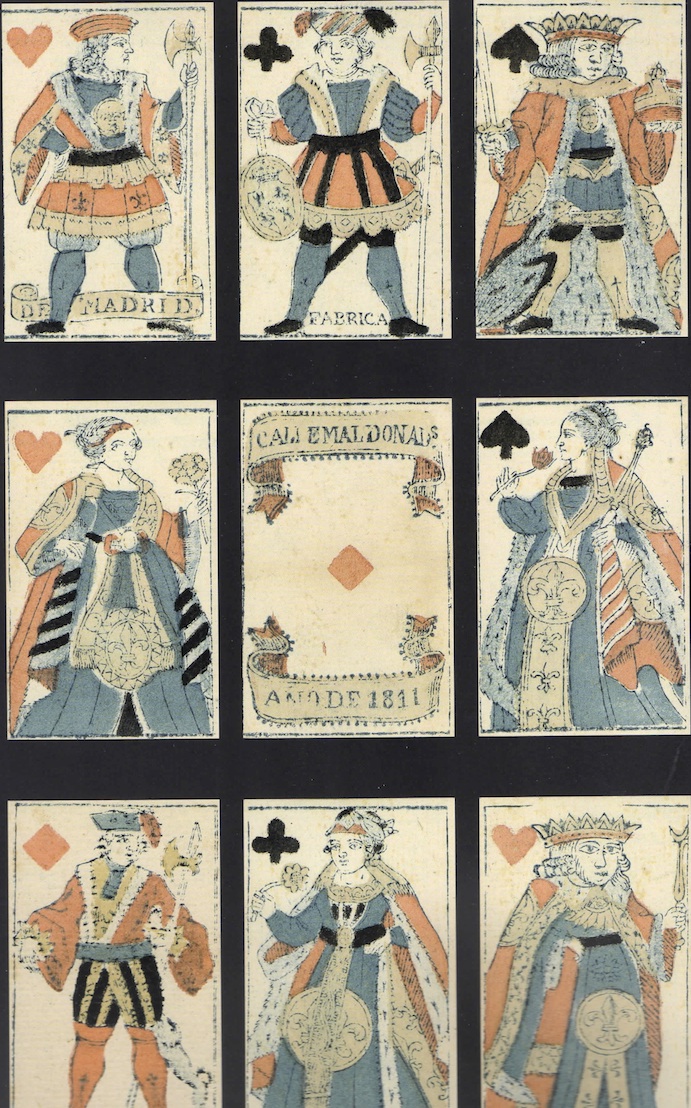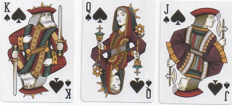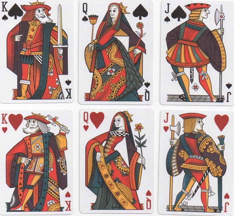 In some non-French versions made locally mixing of the courts' suits has occurred in some cases. In a pack made in Madrid in 1811 shows considerable mixing: the KS is Paris 1 KH, the JH is Paris JD, the JD is Paris JS and the KH is rather nondescript. He could be the Paris KC without his shield or the Lyons 2 KH with a sceptre rather than a scroll. The QC is the Paris 1 QH and the QH could be a turned version of the same figure or the Paris 2 QH with a flower instead of a fan. The QS and JC are the original figures.