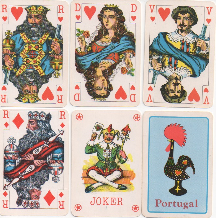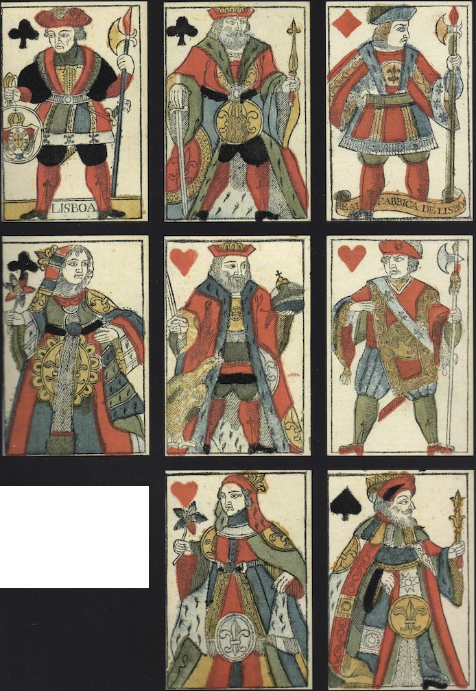 Similarly, there is a pack by Real Fabrica, Lisbon, from c.1800 with a mixture of Paris 1 and Paris 2 and an odd KS, who is actually the Paris 2 KD. The KC has been altered and has his right hand on a sword, the JH has no tunic and the QC is from Paris 1.