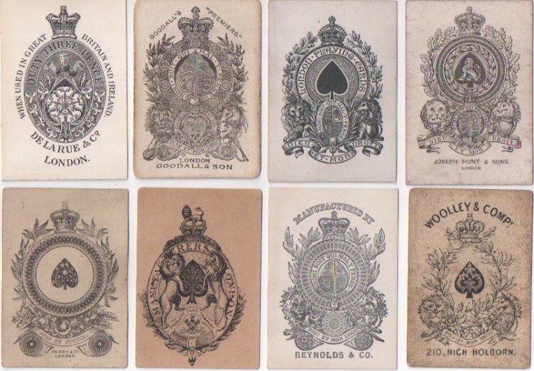 The following are from different makers of the post-Frizzle period, as indicated. In this square-cornered format they cover the period from 1862-90. The De La Rue ace, designed by Owen Jones, lasted a lot longer in slightly different versions, right up until 1957, when the silhouette AS was introduced.