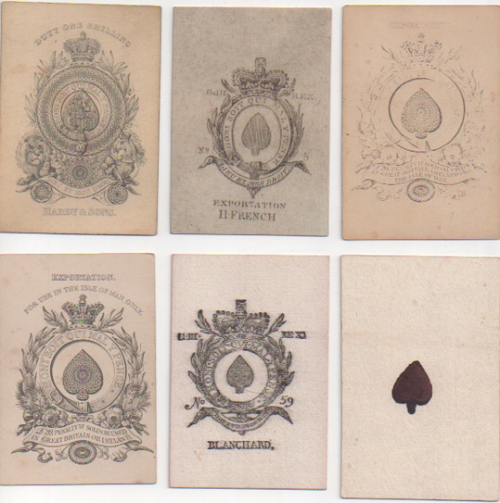 7: A7, Old Frizzle. 1828-62; 8: A8, Export, 1765-1828; 9: A10, Export, 1828-62, here unappropriated from a Whitaker pack; 10: Export to the Isle of Man only, 1828-62, always unappropriated, again from a Whitaker pack; 11: a fake Blanchard A1 AS, probably as late as 1820; 12: another tax-avoidance trick, using another ace and converting it, here an AH, though I also have examples of ACs. A9 is the George IV version of A8 (1820-28).