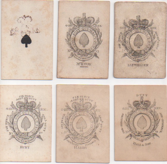 Each new ace represents an increase up until the tax was at 2/6d per pack at the height of the Napoleonic wars (for details, see Berry's section 1, page 3). Ace A6 (1820-28) was the same as A5 except that George IV replaces George III, though both types continued to be used during this period. The tax was reduced to 1/- (one shilling) in 1828 and a new, more elaborate ace was produced, sometimes unappropriated to any particular maker and often rather lightly printed.