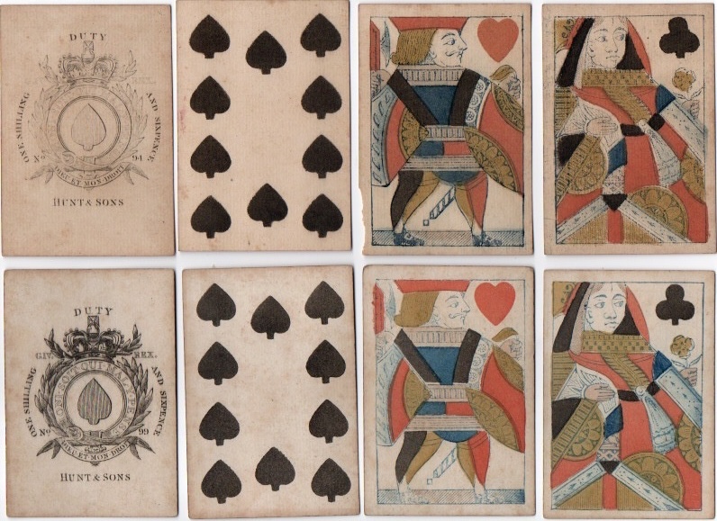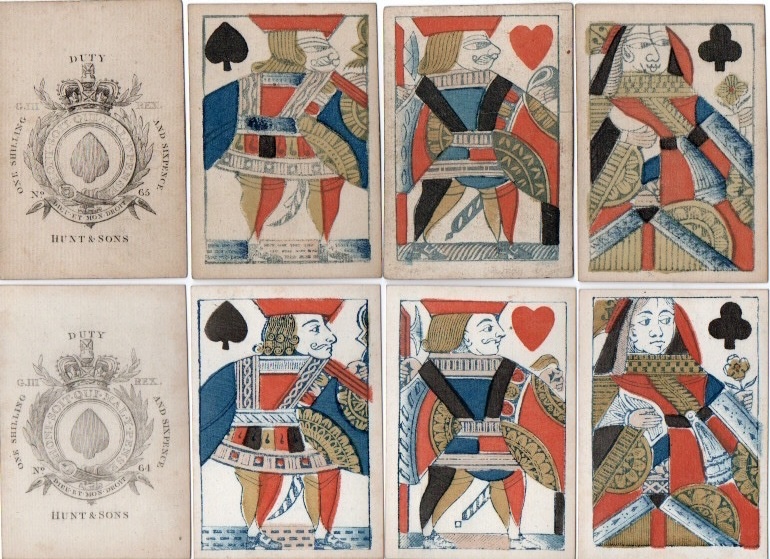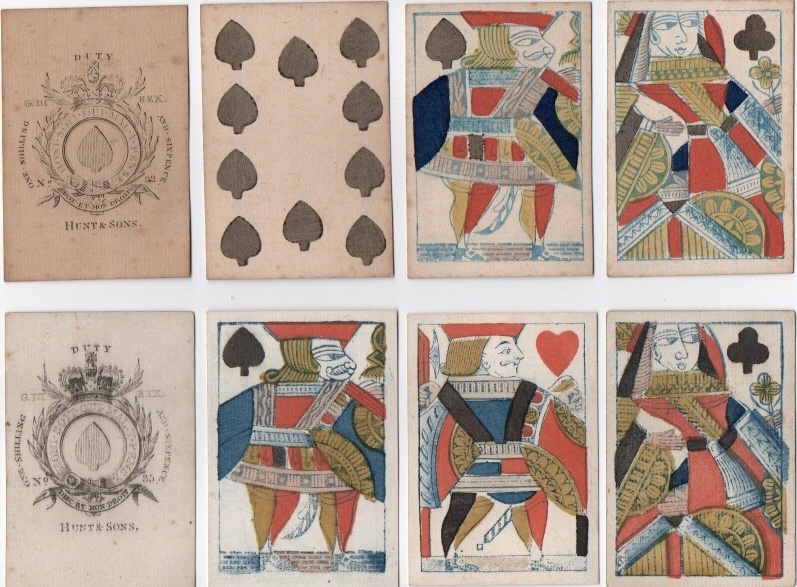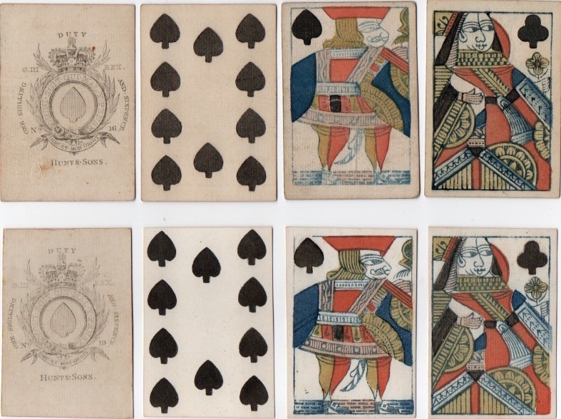 3/4: The ASs are from plates 32 & 35 and both have a second repair mark at the base. This means they date from 1812-16. However, the shape of the spade in the upper pack is different again from 1 and 2 and is of an earlier type, which suggests that the old stencils were still in use. (There is a consistent back design.) The lower example is probably a later secondhand pack in that it has a Hunt HB1 JH, which comes from a later date, as we shall see below. The rest of the courts are Type I. The spade pip is like that of 2.