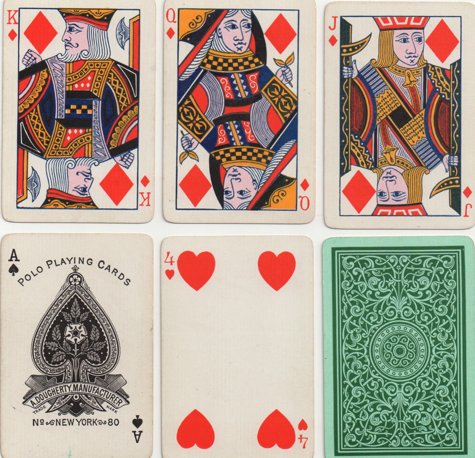 A link between his wide-size courts and his later bridge cards is furnished by the Polo brand, which was made smaller than even modern bridge cards in order to facilitate holding thirteen cards. I don't know whether these courts were also used in the similar sized Jewel brand packs.