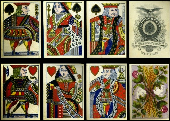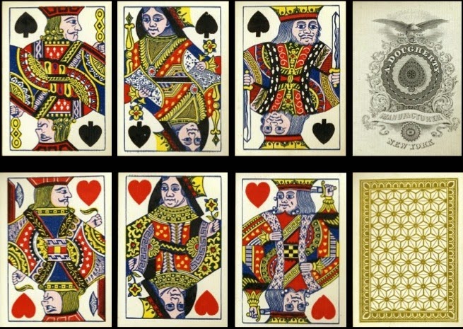 Andrew Dougherty was one of the biggest American card-makers in the 19th century, if not the biggest. After a relatively early start in a small way in 1848, at which time he produced packs of rather poor quality in terms of the cardboard he used, but which had very unusual courts, he invented and developed new methods of production and his business expanded hugely, so that in the 1870s he was producing three and a half million packs a year. Since there is a detailed description of his firm in Tom and Judy Dawson's Hochman's Encyclopedia (pp.67-80), I will not attempt to reproduce it all here. Instead I would like to give examples of the way his standard courts developed. Given his output during the last third of the 19th century, it's hardly surprising that so many of his packs have survived.