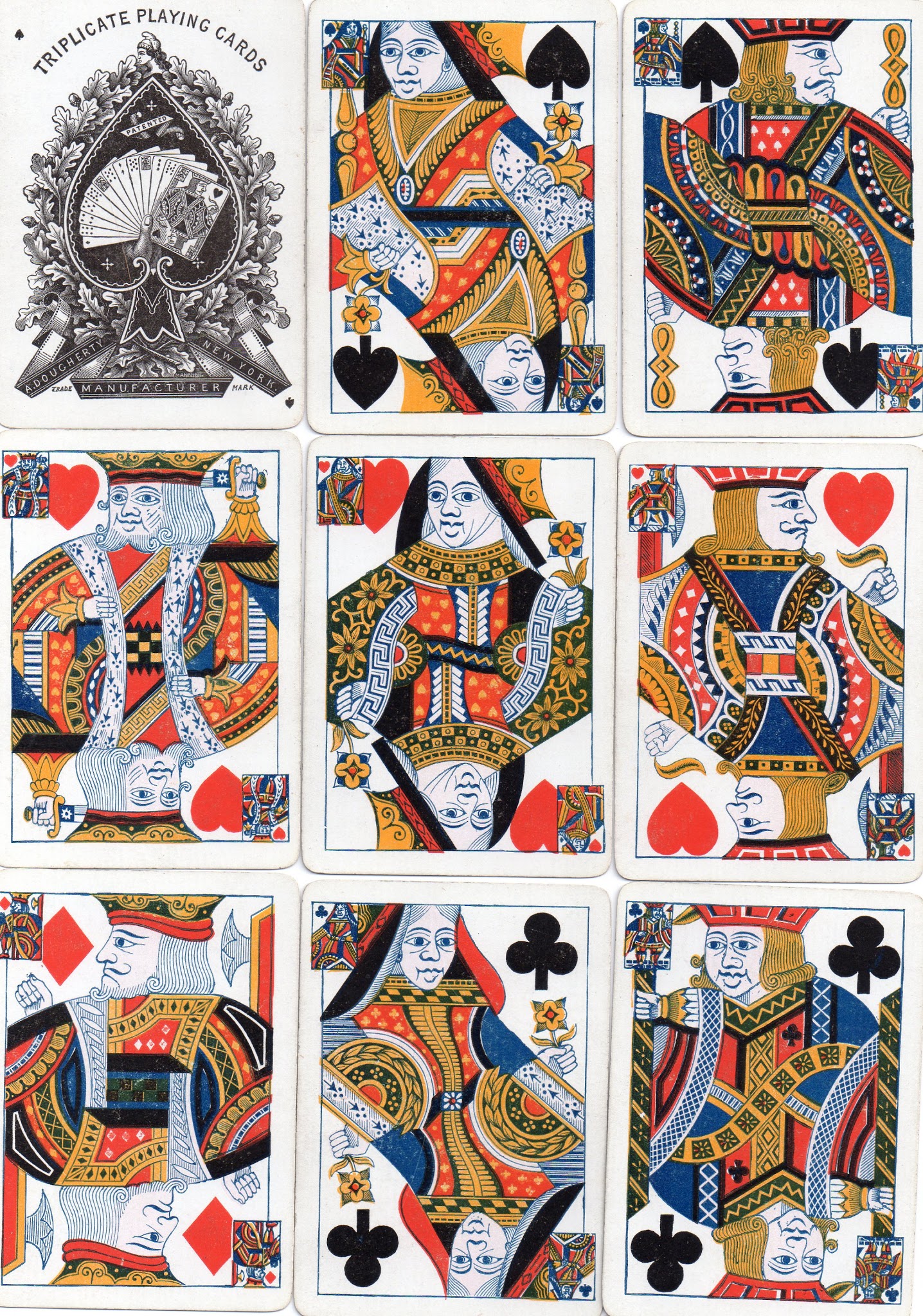 In the 1850s he also introduced packs with the old-fashioned design used in Faro packs, harking back to the wood-block and stencil era, though his were printed in letterpress. These courts were used for many years.