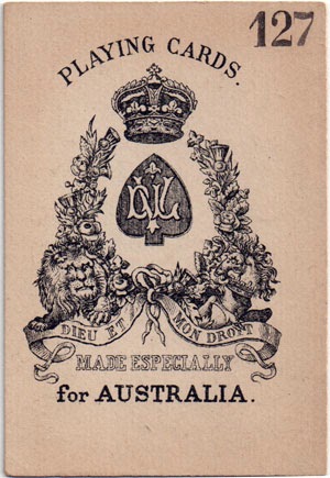 What early 19th century Australian playing cards were like is anybody's guess, though any that there were were probably taken out from England for the most part. Van Genechten supplied cards for Australia, as can be seen from the rip-off Bancks-like AS of c.1880.