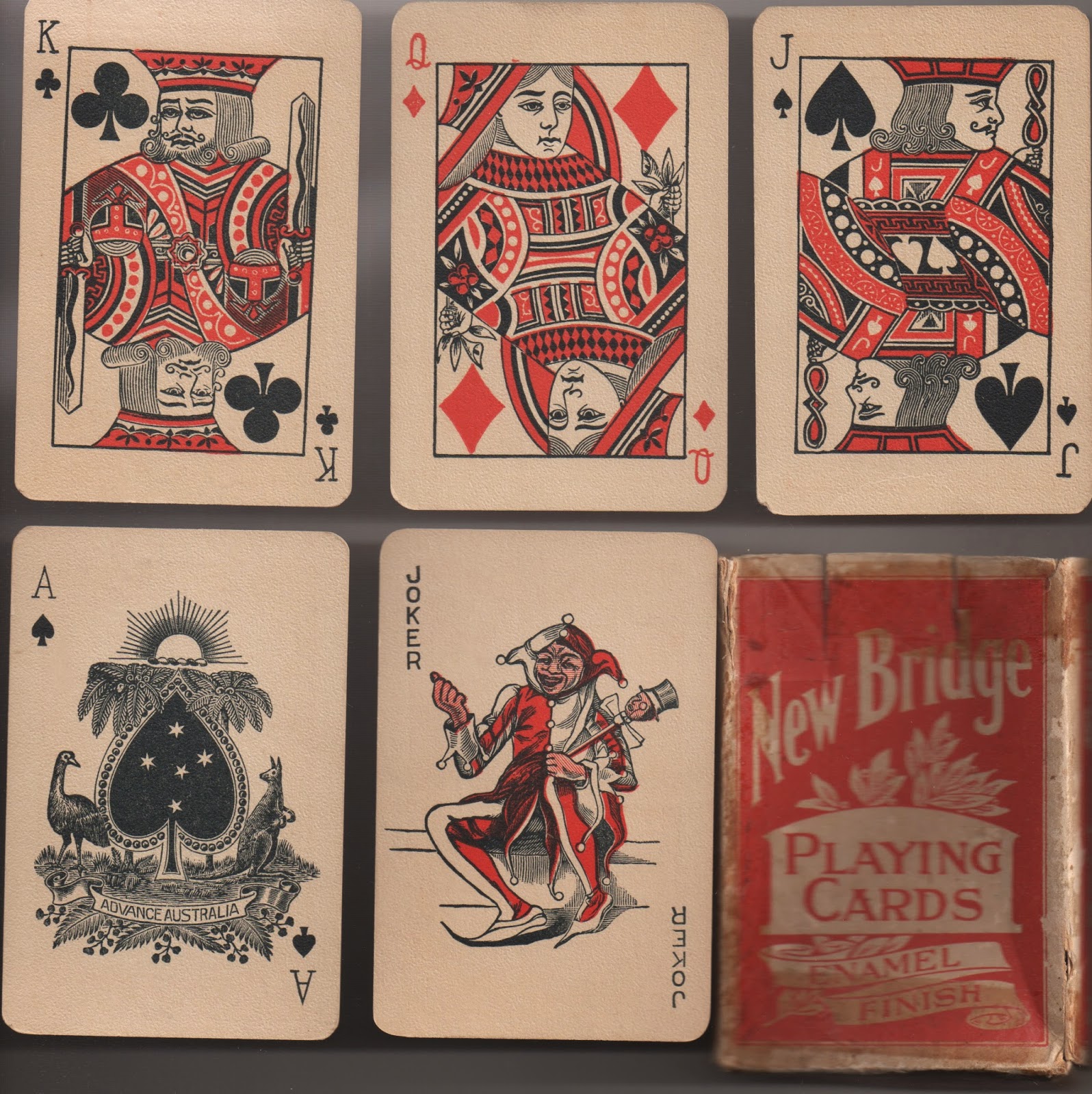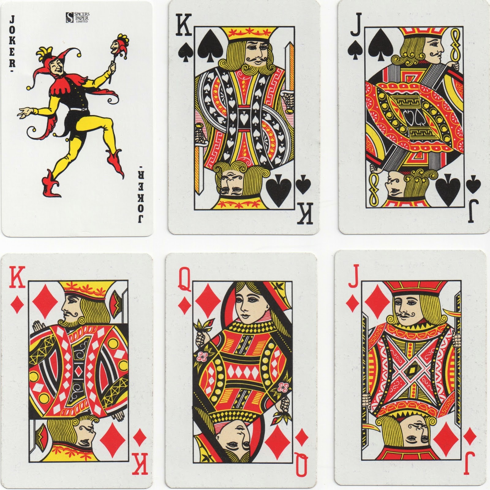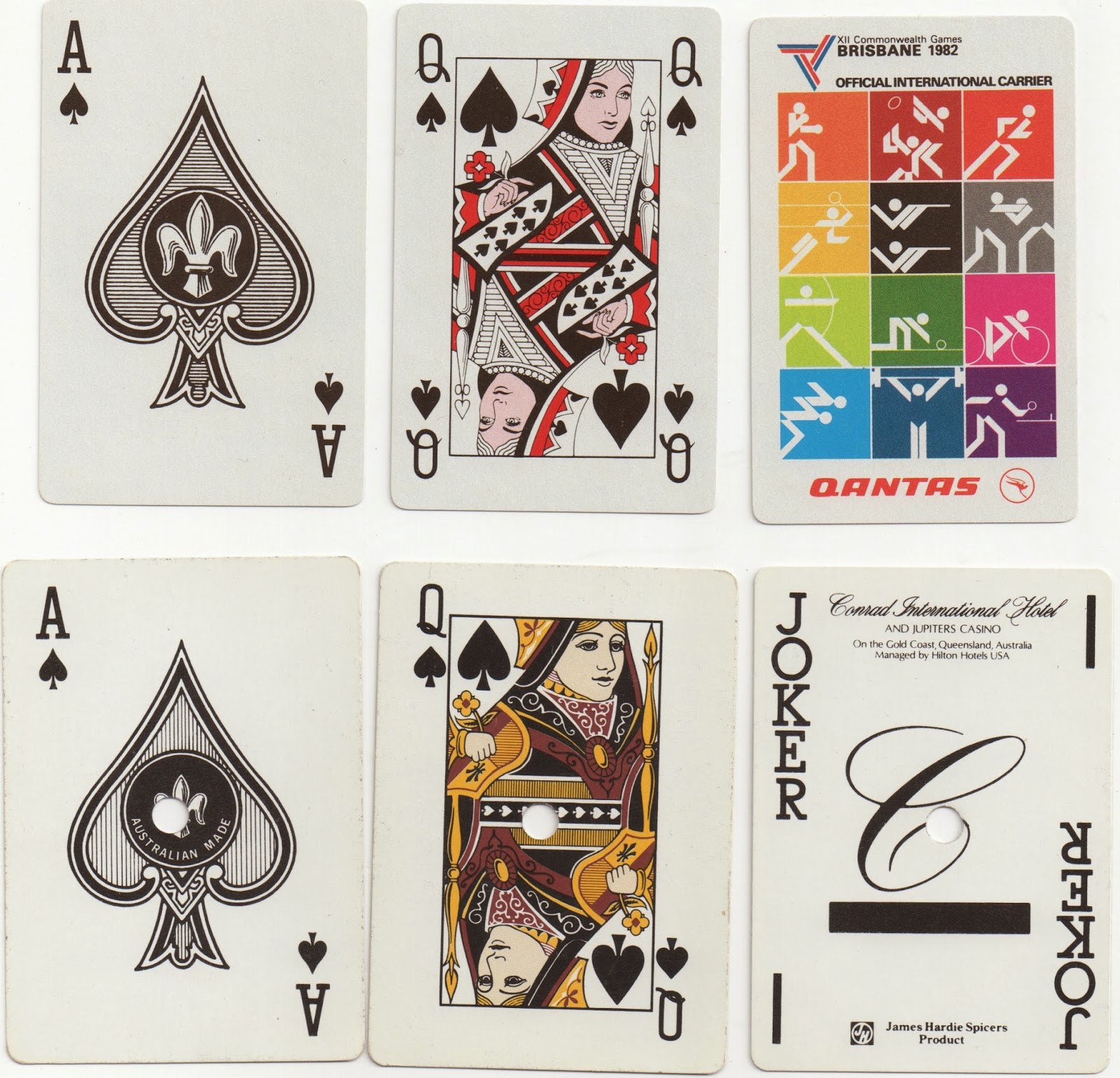 For some reason in 1982 a pack for the Brisbane Commonwealth Games used Piatnik courts and joker in two colours with Reed/Spicer number cards. Shortly after that the former Spicer & Detmold courts were redrawn and used in casino packs.
