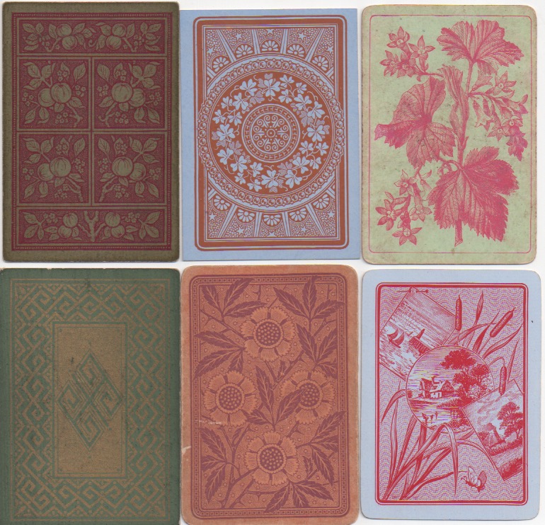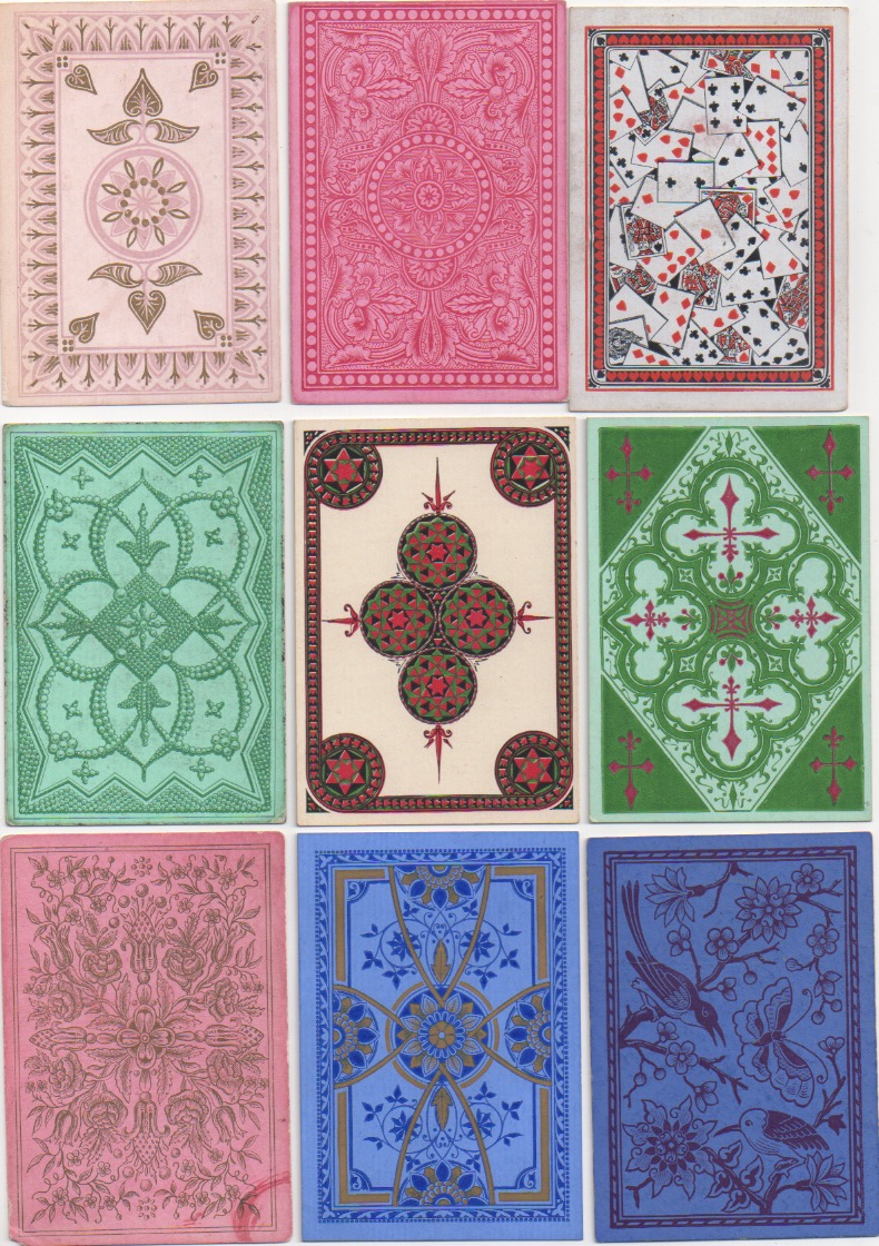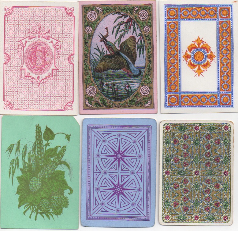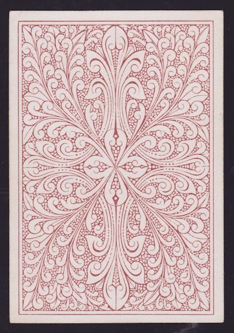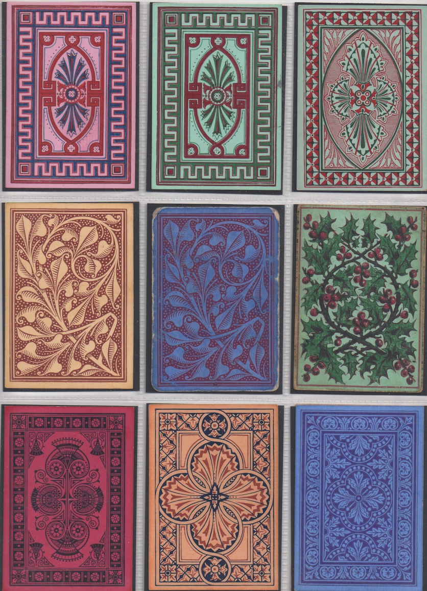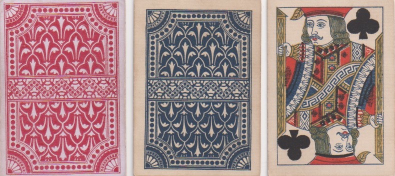 Many people think that collecting playing cards means being interested in the backs. I'm always having to put people right on that score in my own case. Playing cards were invented and became popular because of what is on the front of whatever variety of card you choose. Whoever decided it would be a good idea to prettify the backs was onto a winner. The first reason to decorate the backs of cards seems to have been a practical one: it prevents any transparency there might be in a strong light, if the backs are plain white (or even other colours). But the idea that card-players might like artistically created back designs has no practical significance whatsoever, beyond the transparency issue. If reports in Victorian England are anything to go by, the hardened, serious card-players would no doubt have pooh-poohed such innovations along with all the other 19th century advances that we take for granted today: double-ending, round corners, redrawn courts and even corner indices. Like in most things (good or bad), the pooh-poohers have been swept away in the mists of time.