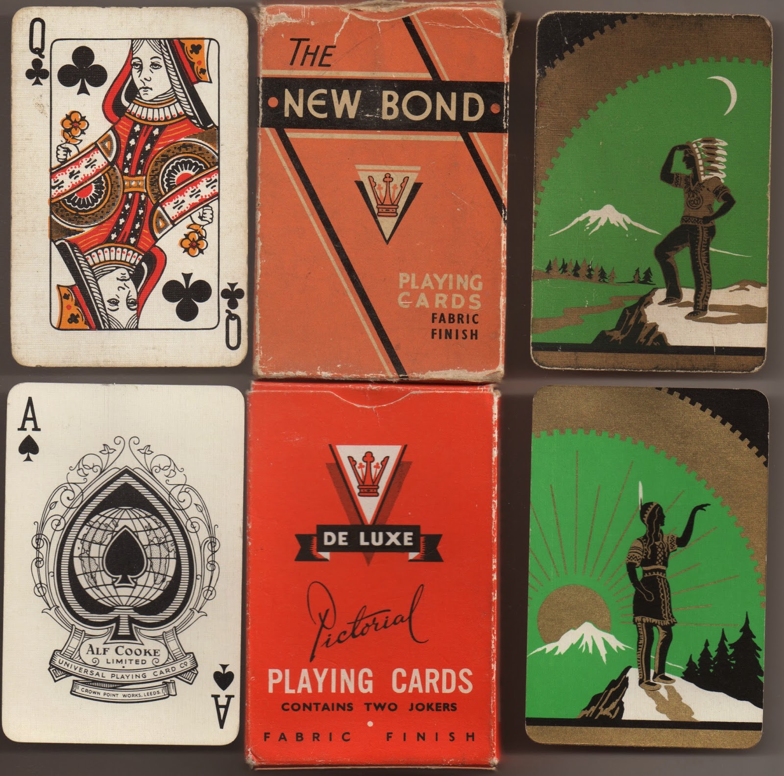 It is worth noting that there are a lot of poor descriptions of backs on eBay. Art Nouveau, Arts & Crafts and Art Deco are STYLES not periods; just because something was designed between 1890 and 1910 doesn't automatically make it Art Nouveau. In fact, Art Nouveau was not as popular in the UK as on the Continent of Europe, and very few card backs were affected by it. If you really want to know what Art Nouveau is all about, start with: https://en.wikipedia.org/wiki/Art_Nouveau. Also, backs from the 1950s often have a flavour of pre-war Art Deco. For example, the pair of backs depicting a Native American couple (perhaps, Hiawatha and Minnehaha) by Universal with an Art Deco influence (though note that the figures are not drawn in this style) appeared first in the late 1930s with three-colour courts and narrow indices (top row), but was still in use in the 1950s with four-colour courts, wider indices and an Alf Cooke AS (c.1955 onwards; bottom row).