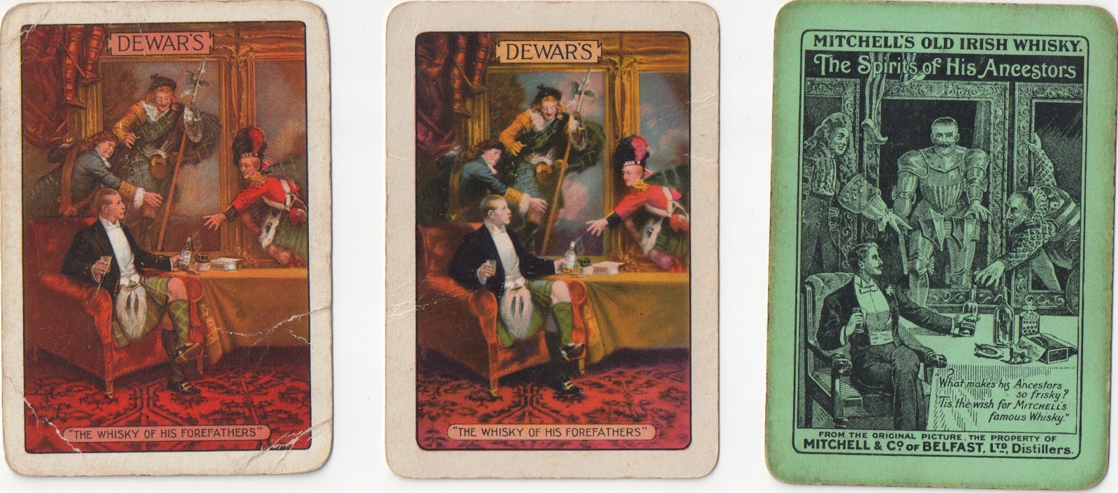 Another interesting whisky advert is the fairly common one for Dewar's The whisky of his forefathers. The two on the left are by De La Rue and Waddington respectively, and date from c.1930. But the green one on the right must be the original: it is called The spirits of his ancestors from a painting in the possession of the makers, William Mitchell & Co, Belfast, so it's for Irish whiskey (even though the spelling on the card is without the usual e). The firm was bought out in 1919. The cards are by Goodall with a London PC AS from c.1905. Whether the copyright was bought or the picture was just copied I wouldn't know, but Mike Goodall has sent me yet another version by Goodall of c.1910, which is clearly the forerunner of the later backs (bottom picture - sorry, it's cock-eyed!).