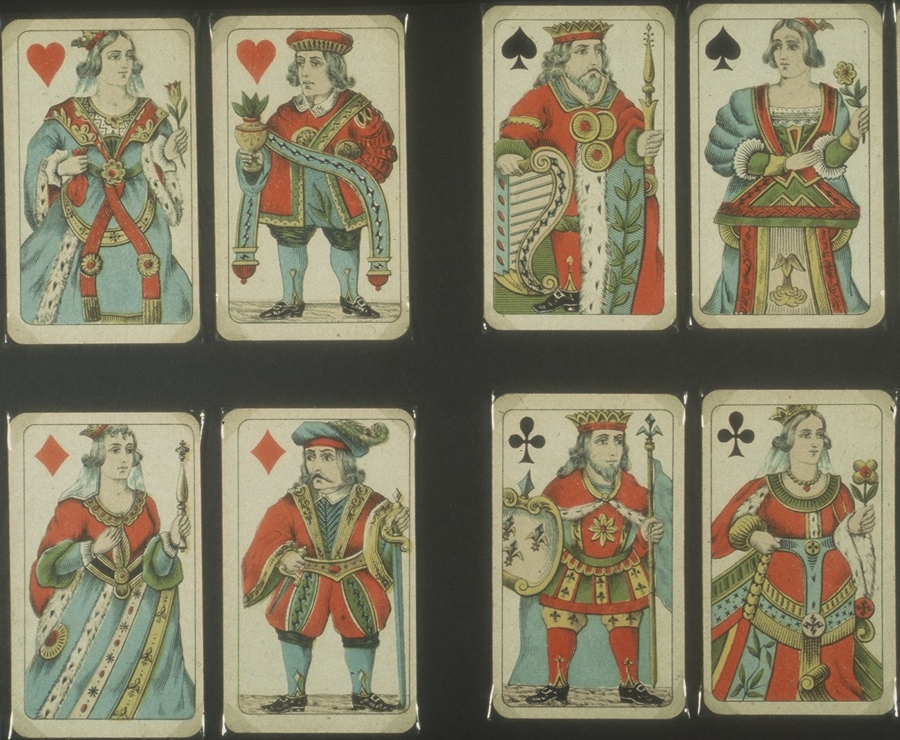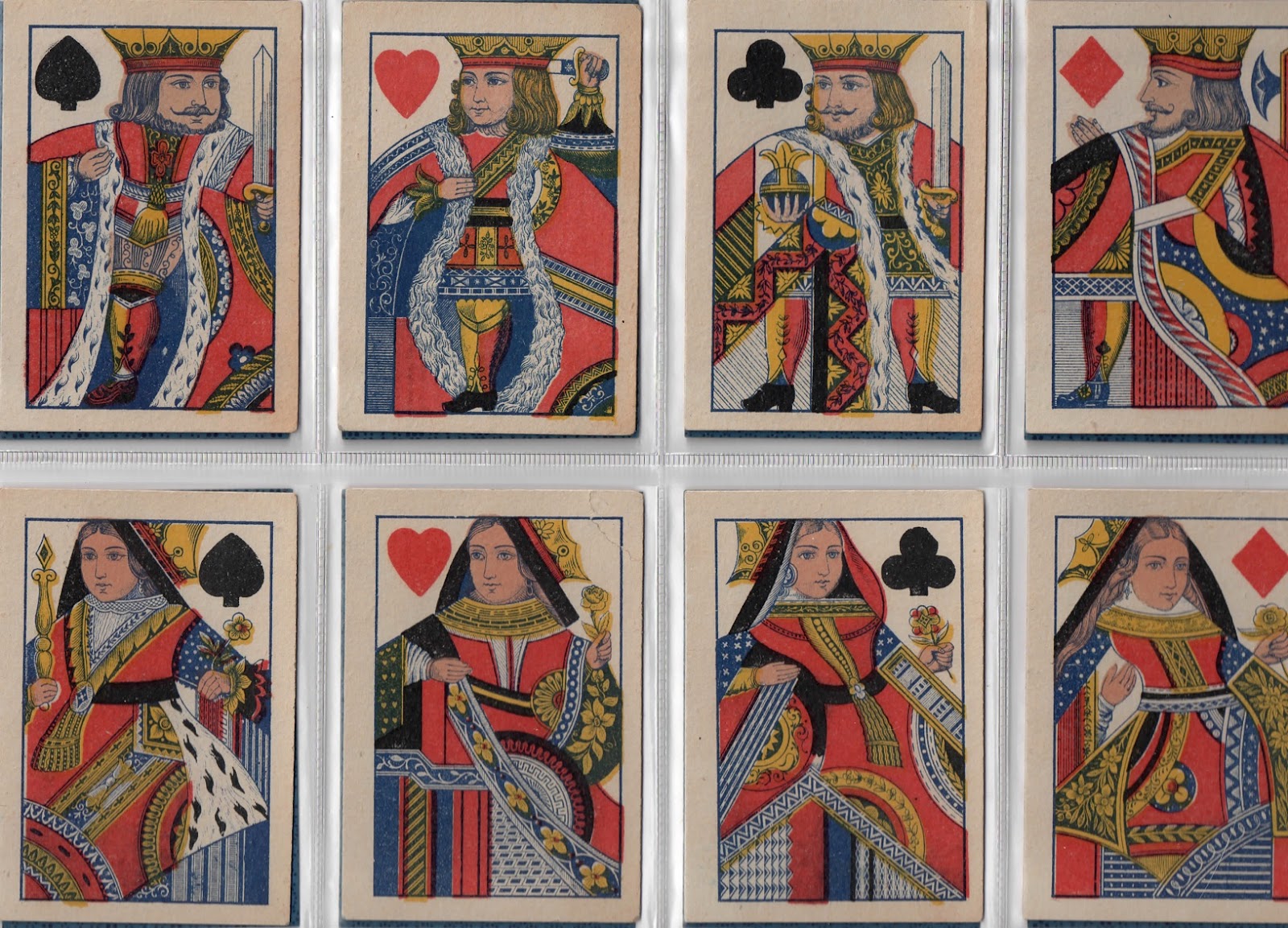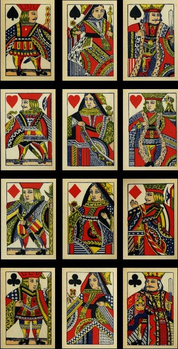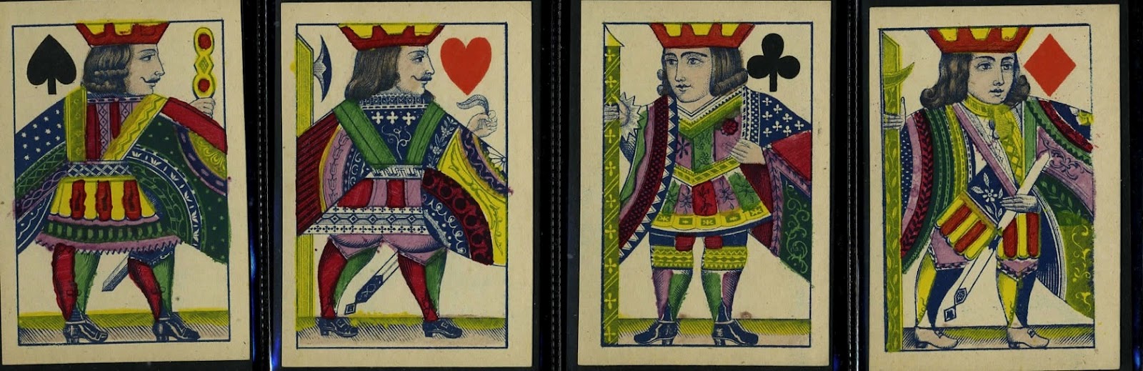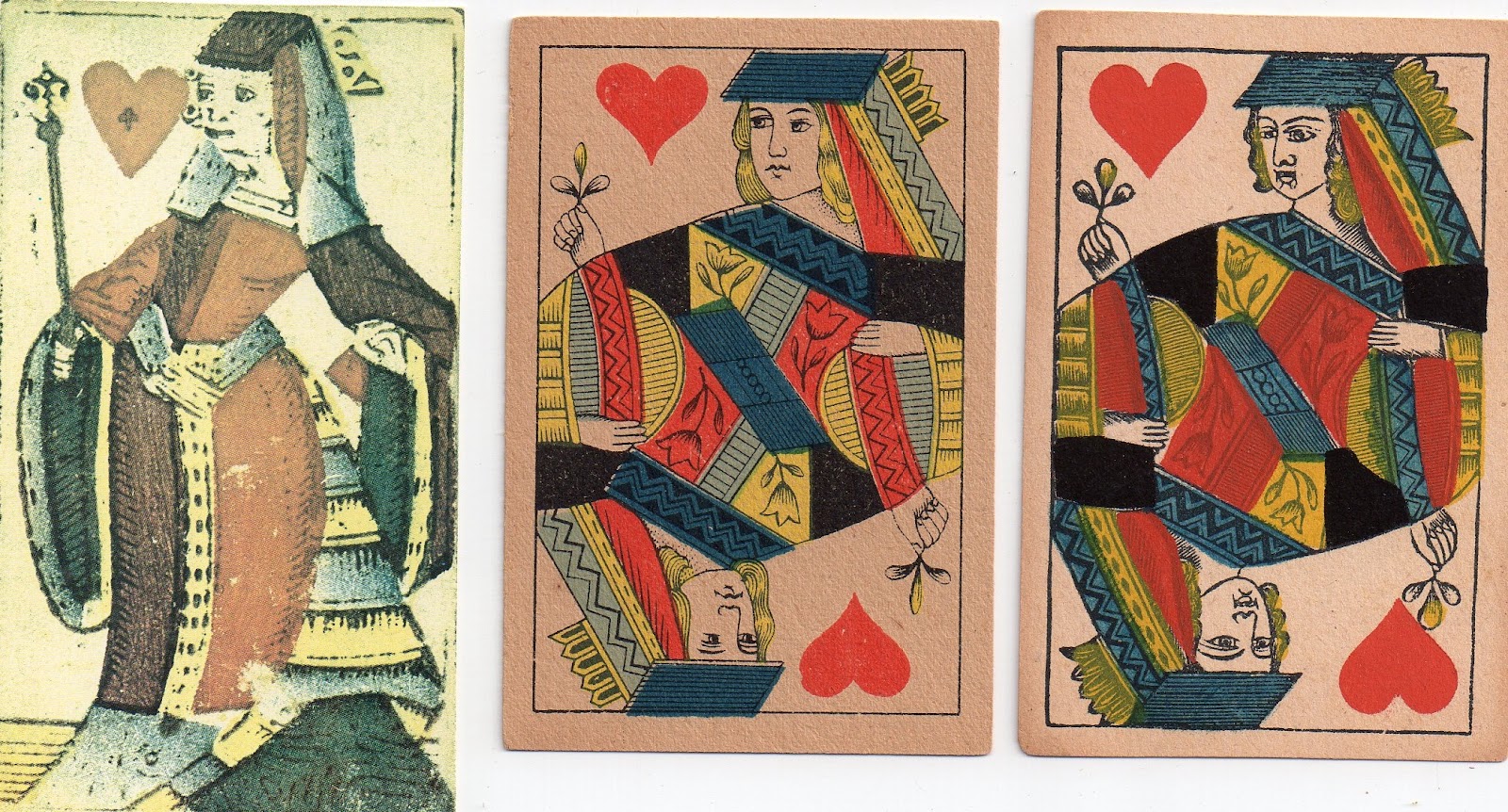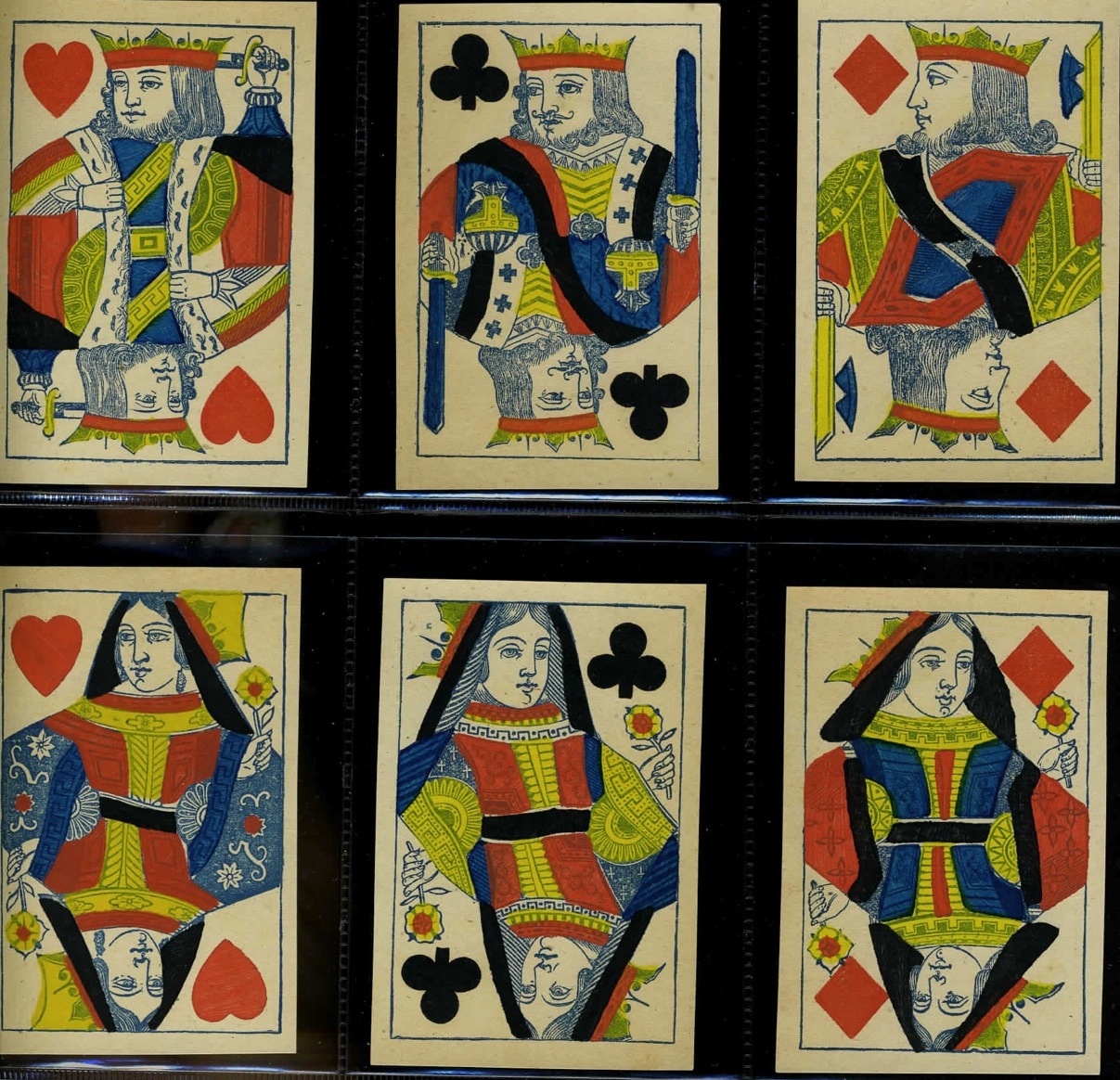 Turnhout makers were inventive and produced north European versions of the standard English pattern with courts that look like those of the packs derived from the Paris pattern and some non-standard packs. A single-figure version is illustrated on page 19 of this blog; a double-ended version is illustrated here, c.1875.