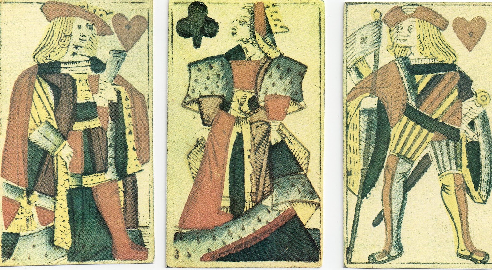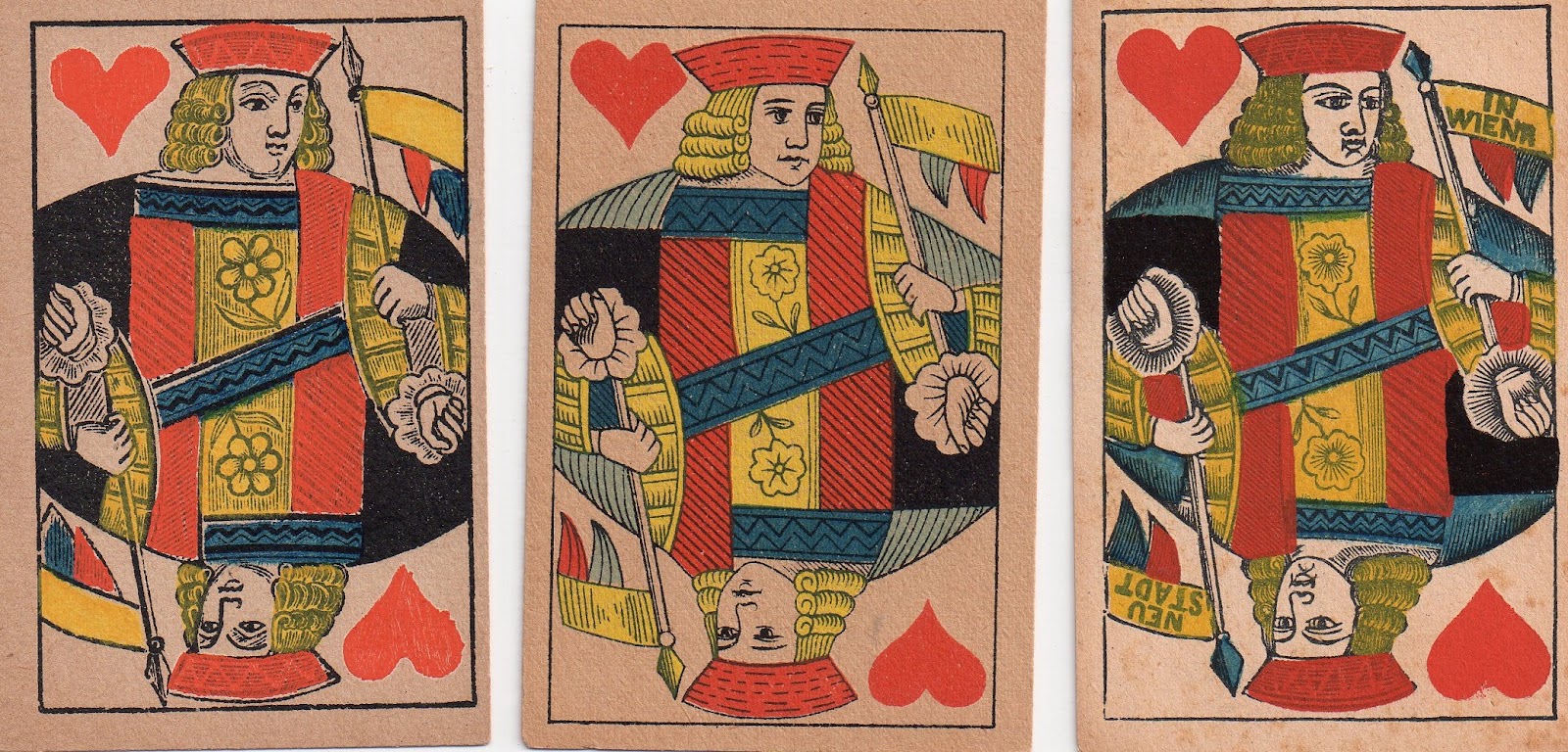 The non-English types were vary varied. A number of non-standard packs are illustrated on other pages of this blog. Below are three different versions of the JH in different styles of the Austrian pattern A, a descendant of one of the Lyons patterns; who made them is impossible to tell. The In Wien on the banner on the right does not mean they were made in Vienna. A few cards from a 16th century Lyonnais pack by 'IV' (from a reproduction by The Scolar Press, 1970) are also illustrated. Note that the figure of the JH is turned in the later pattern.