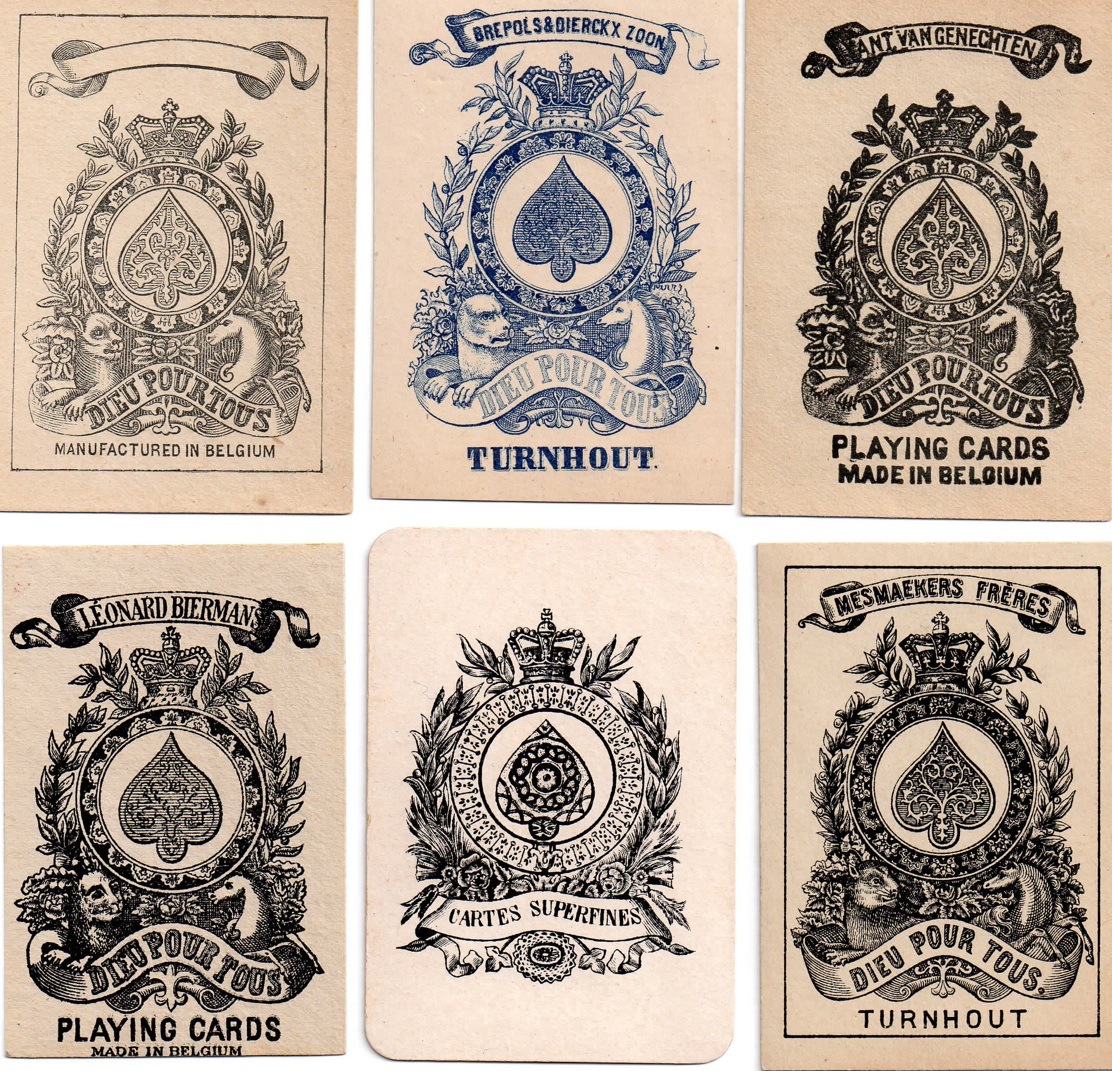 There have been card-makers in various centres in Belgium, but Turnhout is certainly the most prolific in terms of size of output. They also produced a wide range of types of card, from Chinese money-derived cards to Portuguese dragon aces packs to non-standards as well. As regards the standard English pattern, they have always been inveterate copiers of other makers' designs, but after c.1850 started to develop their own as well. These designs were often used by different makers with variation in the details. The main problem with Belgian cards is that they are often anonymous, so unless you have sets of plates relating to named makers, it's down to educated guesswork as to who actually made them. The Turnhout makers also made cards for other publishers, who had their own named ASs (just as in many other countries), or the makers themselves may have used pseudonyms, especially for the export trade, such as Ansell or Davis, both based in London.