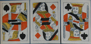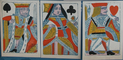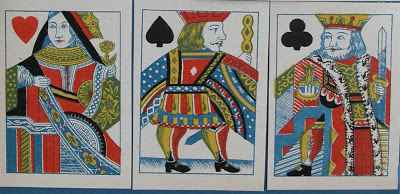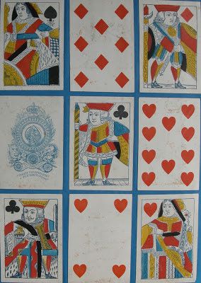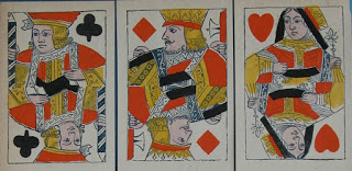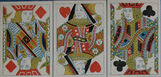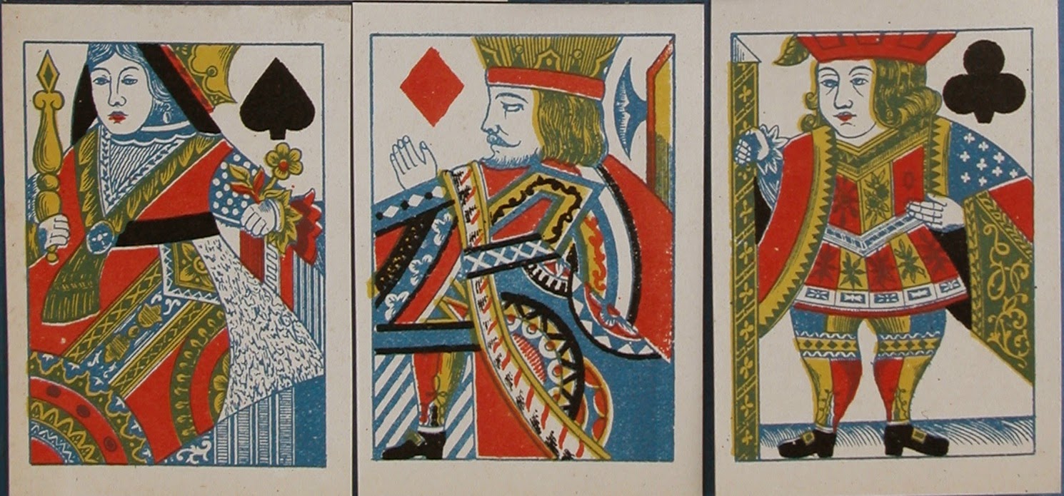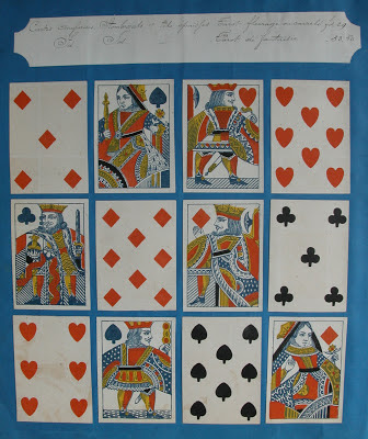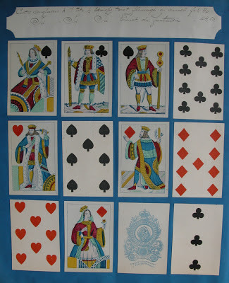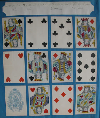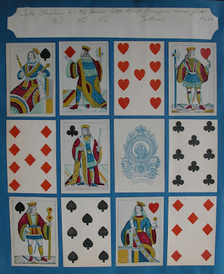 Antoon (Antoine) Van Genechten started printing playing cards some time between 1837 and 1841 in partnership with Jacques-Edouard Glénisson. This partnership was dissolved in 1855 and Glénisson continued a separate card-making business until 1899. Van Genechten, on the other hand, continued into the twentieth century and was one of the component parts of Carta Mundi. A prolific card-maker, he has left behind many examples of his work. In addition to the traditional Turnhout version of the English single-figure courts (based on De La Rue's D3) he produced a most unusual version, which I illustrated on page 19 of this blog.