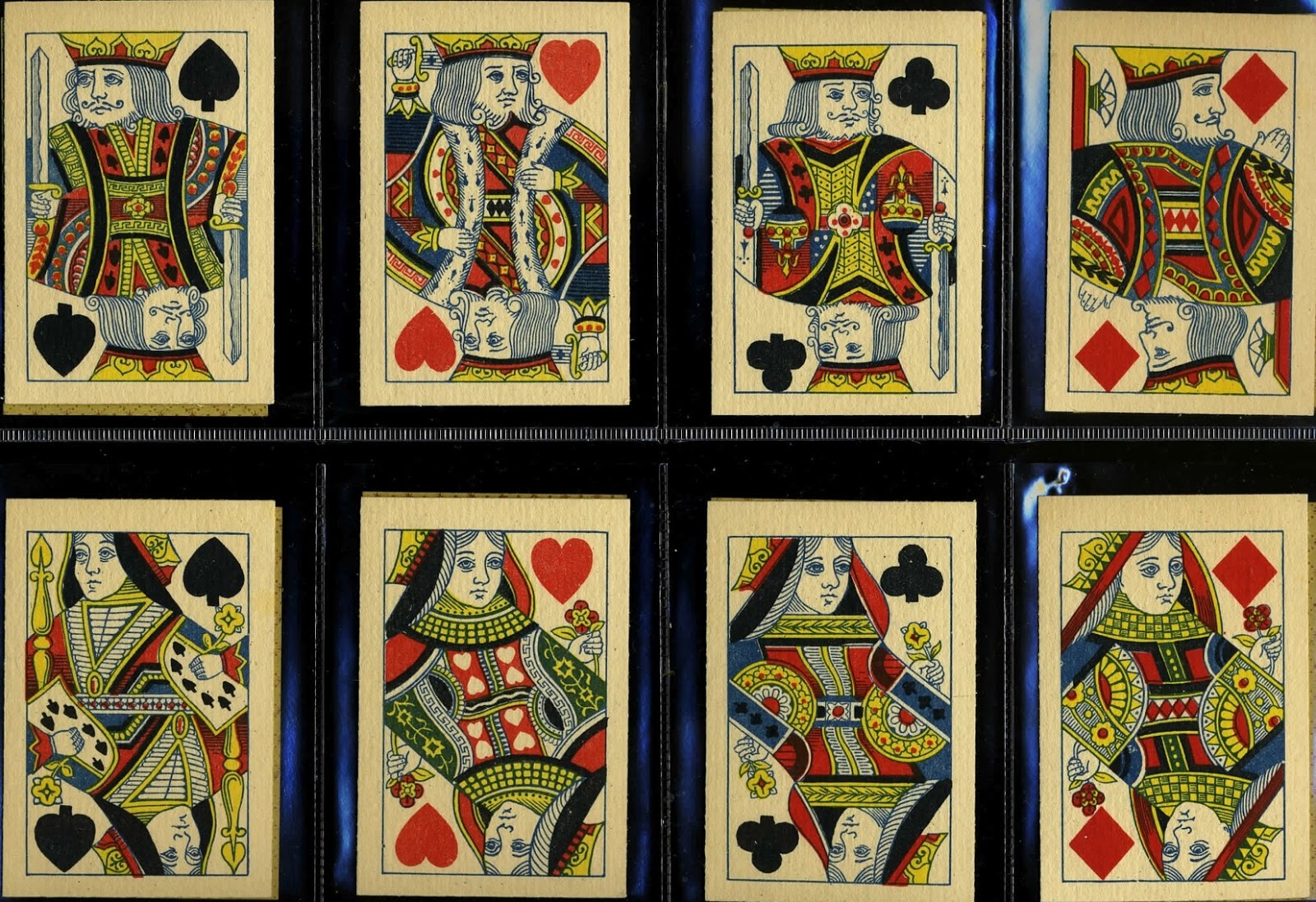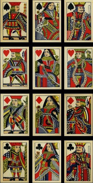 And he used Reynolds' single-figure courts (R1) and made a double-ended version of these. Note that, as was quite common in Europe at the time, double-ended courts are made from single-ended courts cut in half with the head half printed both ends. (For a full pack using these double-ended courts, see page 53.)