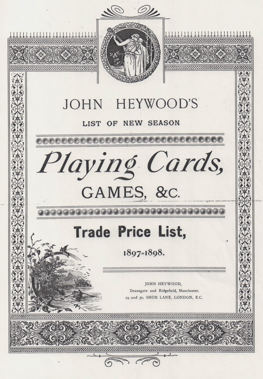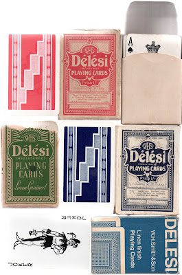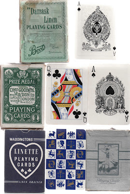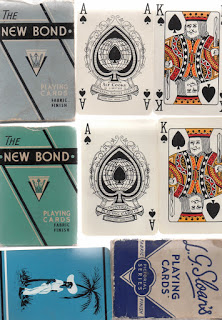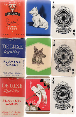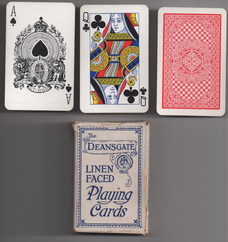 (6) As an example of a smaller firm selling their own brand, here's a pack of Deansgate playing cards by De La Rue for John Heywood Ltd, Deansgate, Manchester. They are very ordinary cards with the ubiquitous anonymous Goodall/London PC AS and the back used in De La Rue's own Crown brand. Without the box, they would be impossible to identify. They date from c.1937.