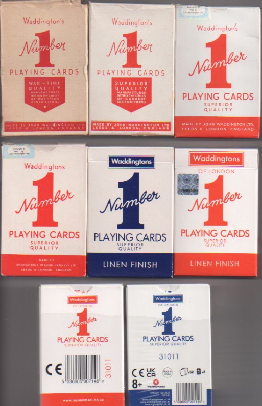 (9) Perhaps the best-known British brand is Waddington's No.1, as it's still being produced. It was first introduced in c.1941 as a cheap brand, taking over from pre-war Viking and Excel, though the latter was reintroduced in the late 1950s. Below are a number of boxes showing differences through time; the contents also hold clues as to dating.