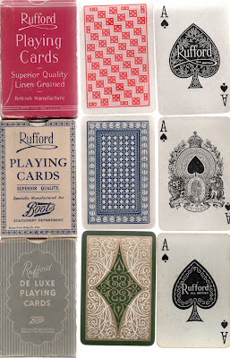 (2) Another Goodall/De La Rue brand for one particular outlet was Rufford for Boots the Chemist. Neil Darbyshire has recently written up this brand in the EPCS Newsletter. It appears to have been started about 1930 and continued until the early 1960s. The top two examples are from c.1930-35. Note that the anonymous AS6.1 (formerly Goodall's London Playing Card Co design) has been used in the middle one. The bottom one is from c.1955 with a redesigned AS.