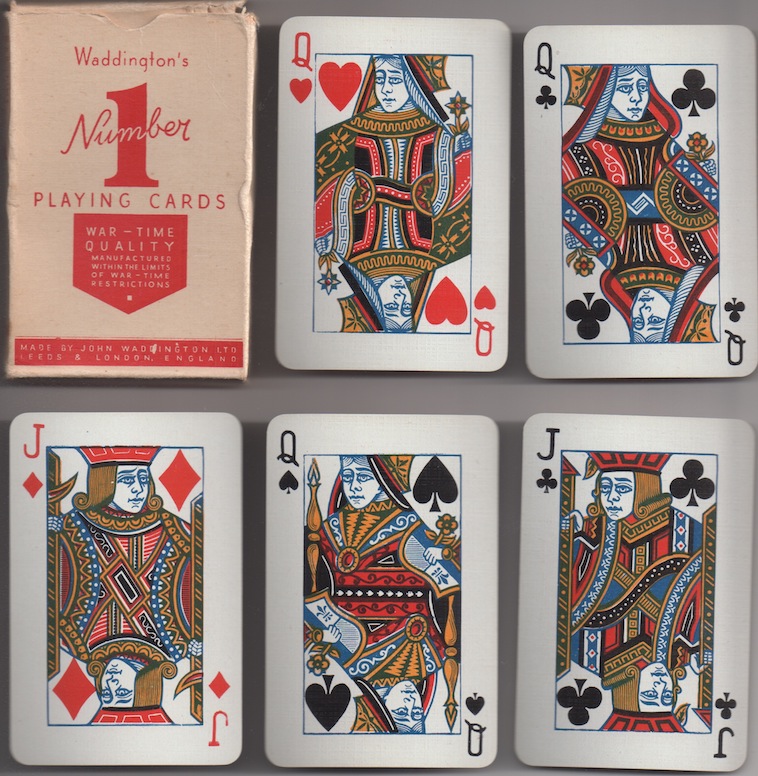 The pre-war Crown packs had GD10 courts up until c.1933, then GD11 and finally GD12 courts. These seem to have been continued into the war period, as I have a pack in a wartime quality box of the second design above, but with GD12 courts. After the destruction of De La Rue's factory, after the available stock had been sold off, Waddington started to print the Crown brand with the same kind of box, but with their own W5.1 courts. These lasted until the end of the war. In 1946 the card-selling part of the firm became known as De La Rue & Co Ltd, Stationers Division, and this appears on the sides of the box. By this time the courts are W5.4. By 1950 the courts have been replaced by W5.5.
