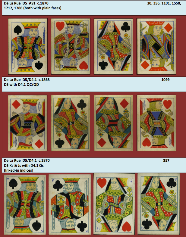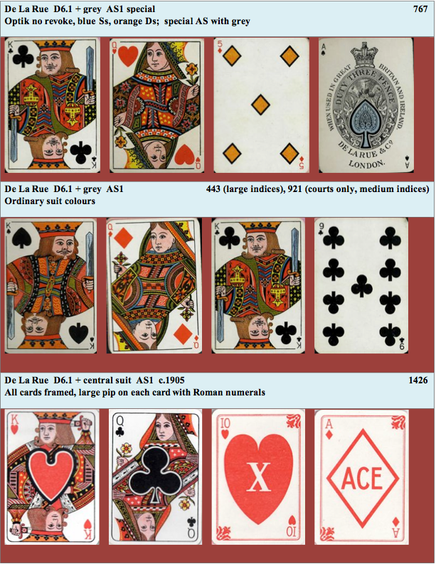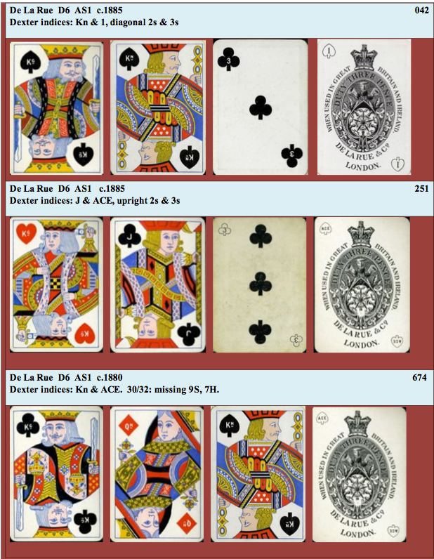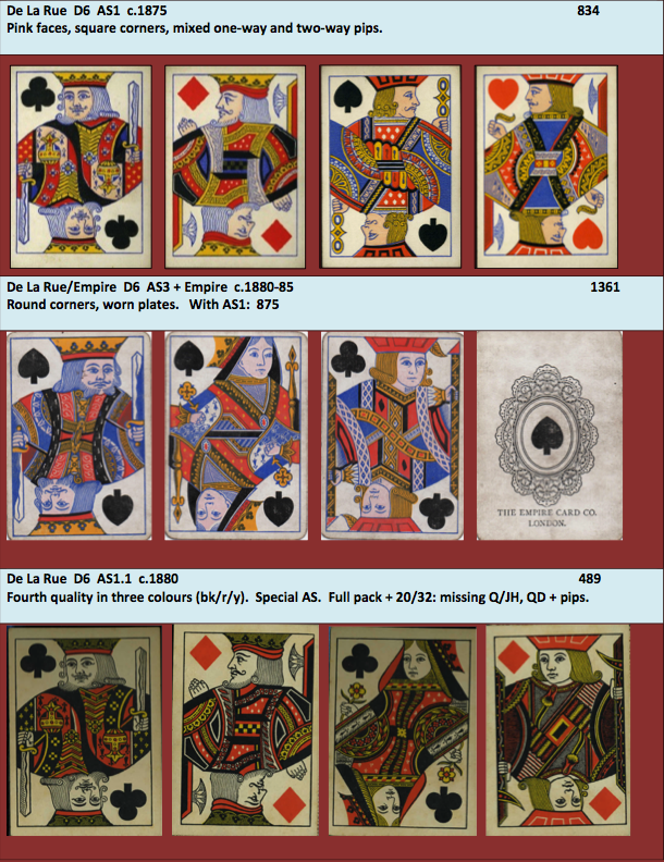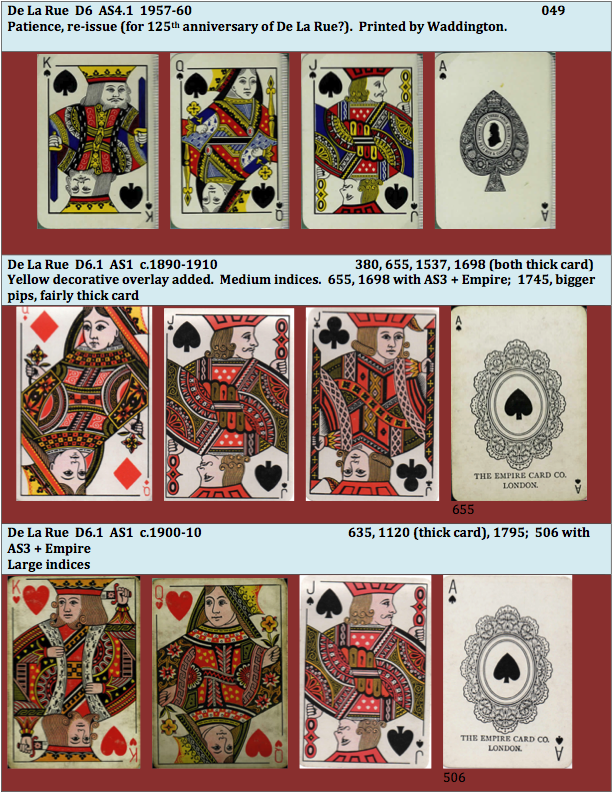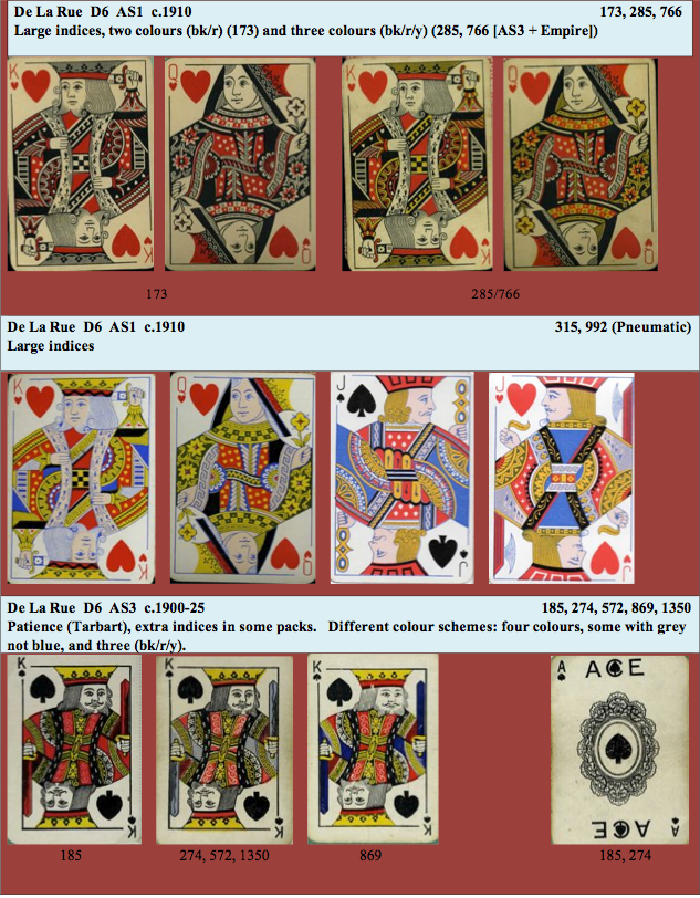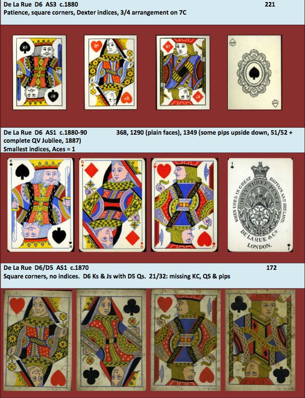 Some people may ask, with justification, "How can I be so certain about my statements, particularly as regards dating?" The answer lies not simply in the length of time I've been collecting and observing cards, but in the background information that's available (sometimes rather limited) and the cards themselves. The task is to relate the cards to the background circumstances to give an overall picture of how a maker's cards developed. I have already dealt with De La Rue's cards on page 5 and page 28, but here is the database of cards I have. The three- and four-digit numbers on a blue ground and in square brackets in the text are my catalogue entry numbers; some images have no numbers, as they are of packs no longer in my possession. For a complete list of all the De La Rue packs in my collection, including those with Goodall courts and Waddington courts, click the links: part 1 / part 2►