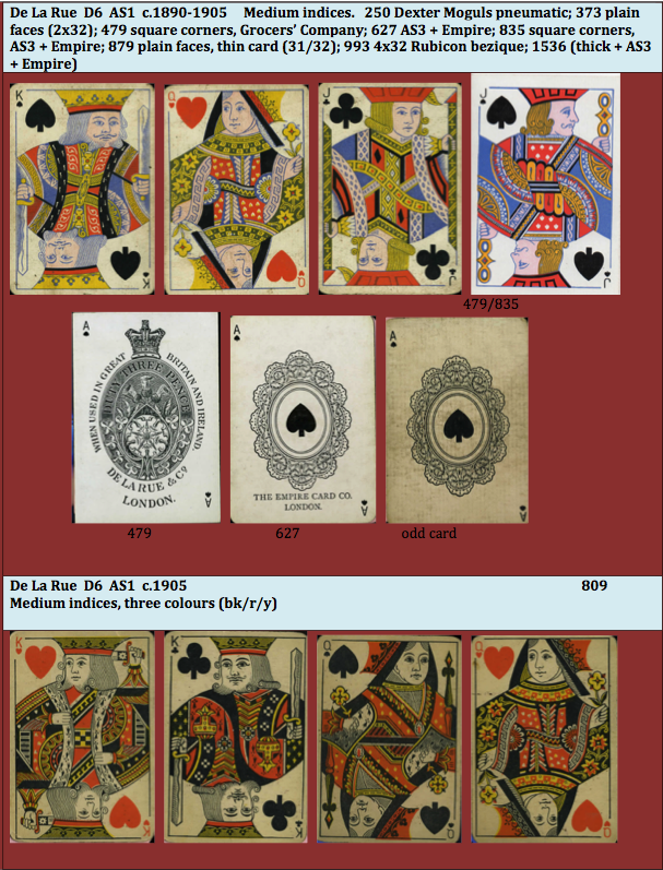 The medium-sized indices were in 1902 in the Coronation pack for Edward VII; the larger ones were used in the De La Rue special pack for the Worshipful company of 1904. There was no doubt some overlap between the two types of index.