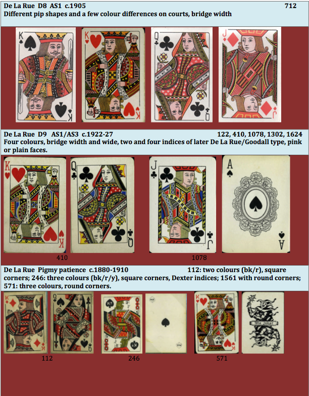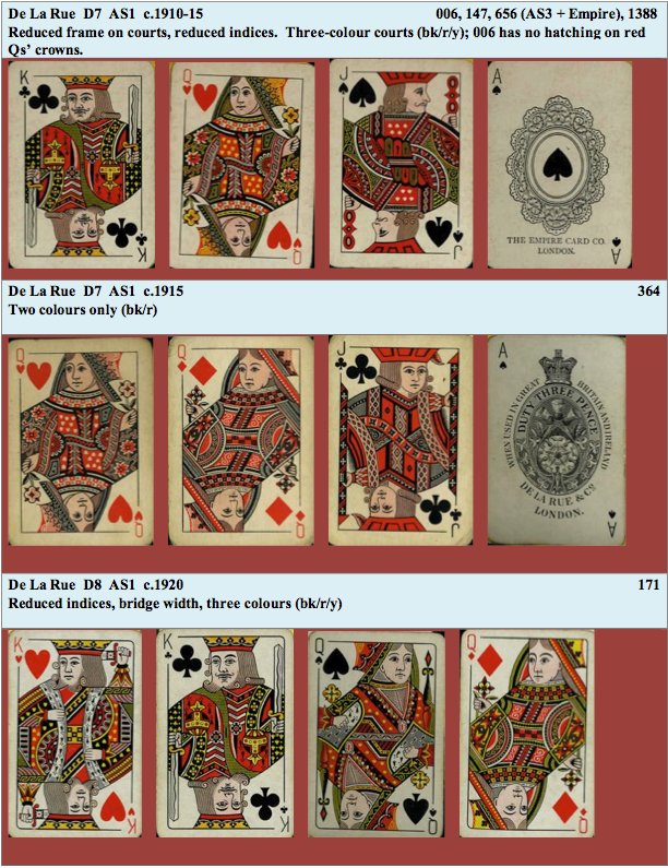 The earliest dated example of D9 I know is the 1919 Peace pack. The latest dated De La Rue cards I know with D9 courts is 1927, so some time around this date the De La Rue design was discontinued and the Goodall design was used in all packs. Such packs are dealt with under the Goodall design (page 12). In the 1940s there were also De La Rue packs with Waddington courts, as illustrated on page 12 (under Goodall).
