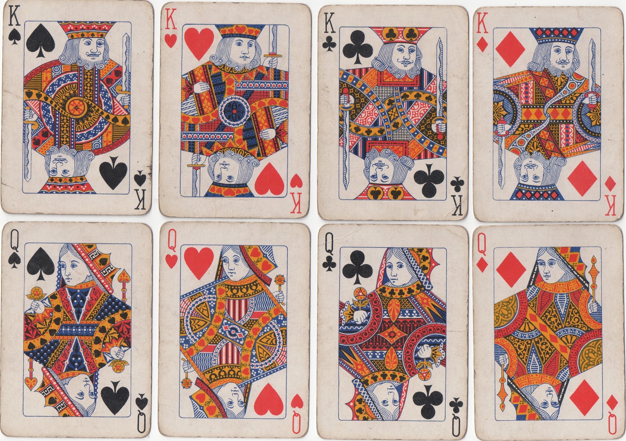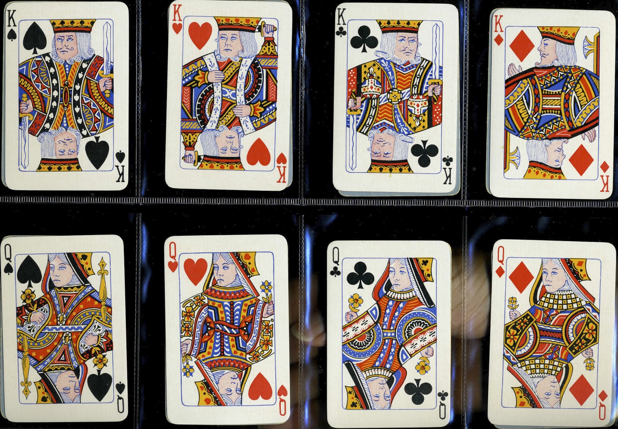 Universal's predecessor, British Playing Card Co., disregarded tradition even more. Some of their courts hardly count as standard English, if traditional features count for anything. The clothing is idiosyncratic and in the version illustrated below the courts of the same rank all face the same way. Note that the KD is not in profile and the QD holds a sceptre. All the pips are on the left.
