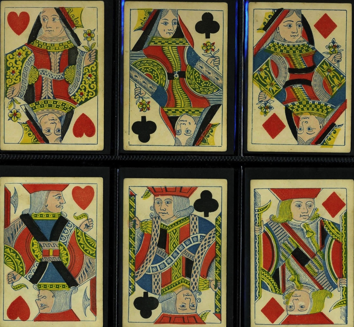 To start with (i) was used by most cardmakers. This meant turning the figures of the six courts with right-hand pips: QS, QC, QD, JH, JC, JD. In most cases it also meant redrawing these courts (or all of them), rather than just reversing the relevant plates (which was probably impossible).